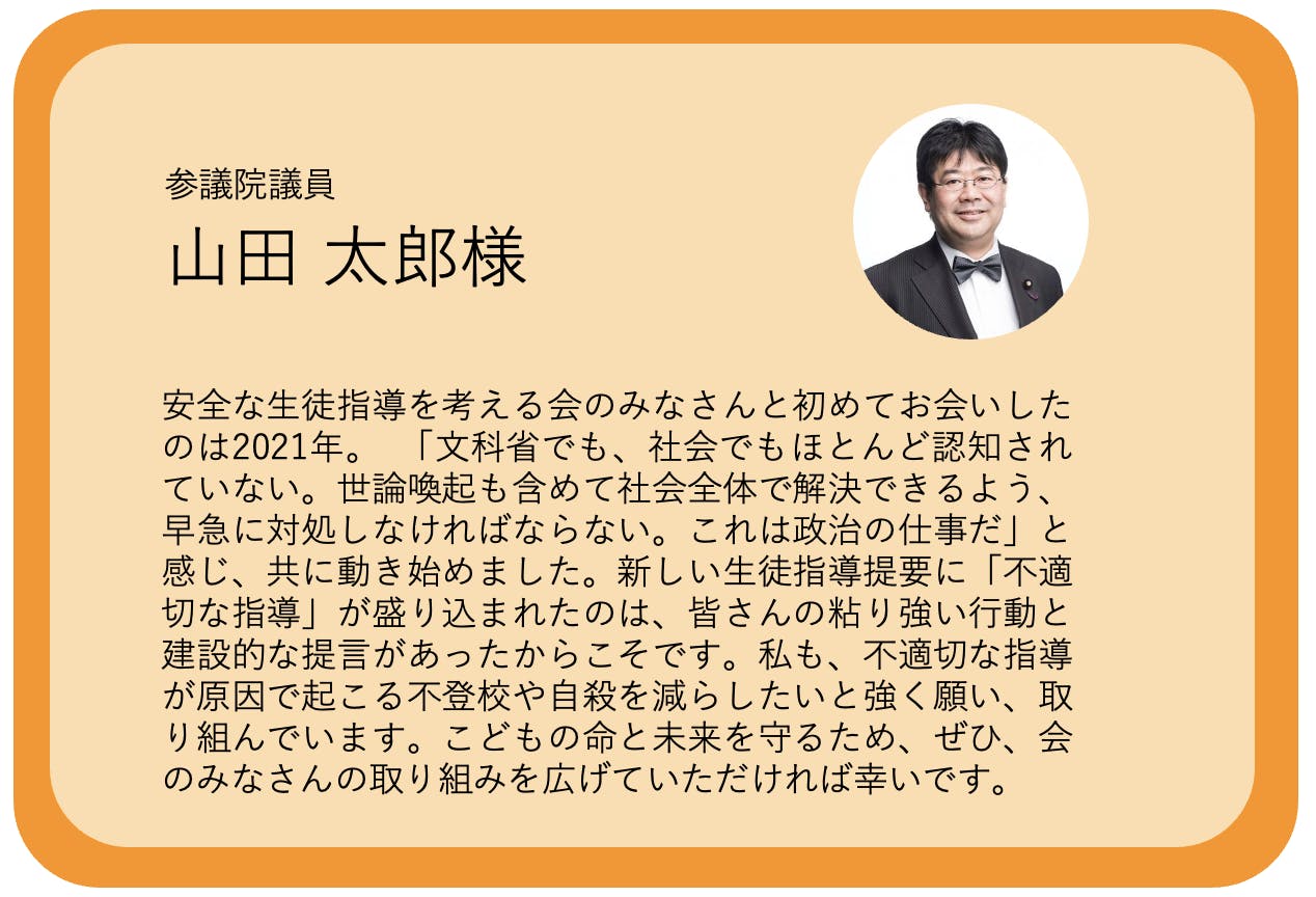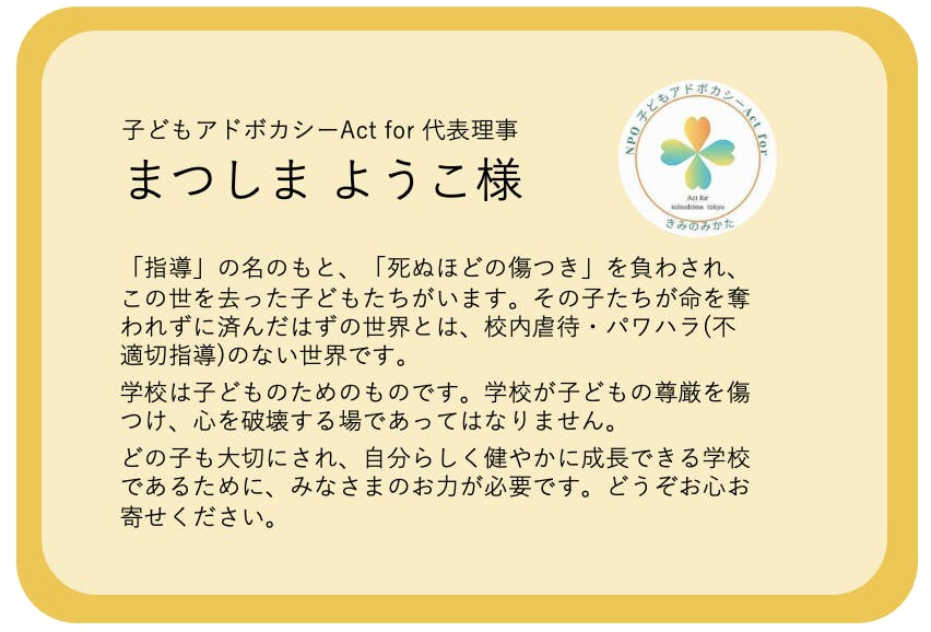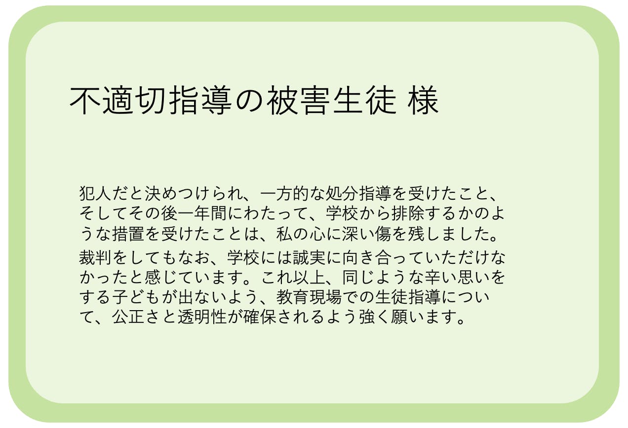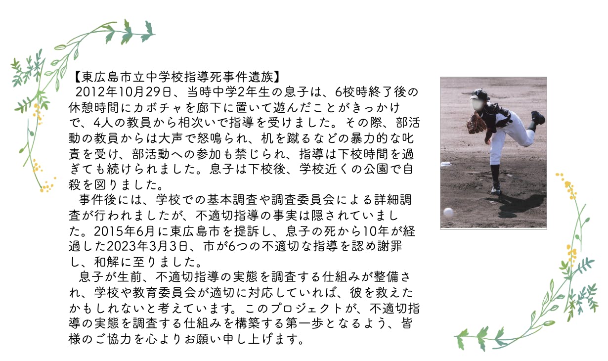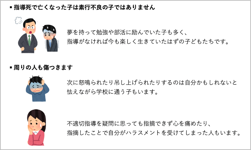 子どもの自殺や不登校には、私たち大人の行動次第で防げるケースがまだあります。不適切指導のない学校にしていけるよう、どうかご協力をお願いいたします。