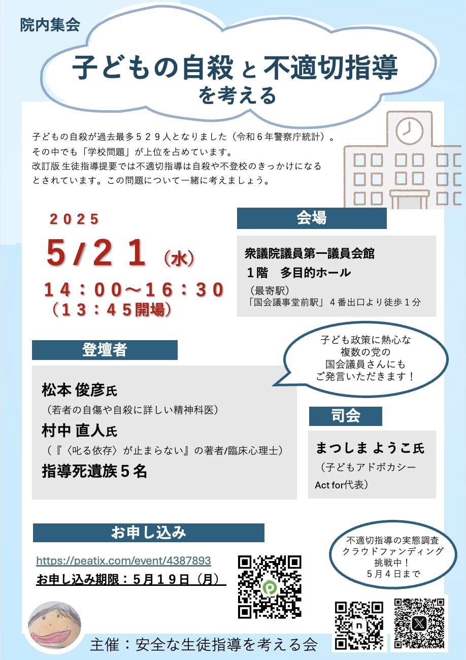 5月21日に、「子どもの自殺と不適切指導を考える」という集会を衆議院第一議員会館で行います!どなたでも参加可能です!