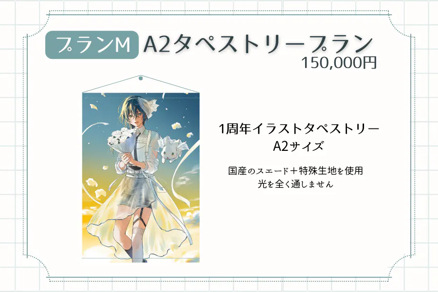 一周年記念イラストを使用したA2サイズのタペストリーをお届けするプランです
