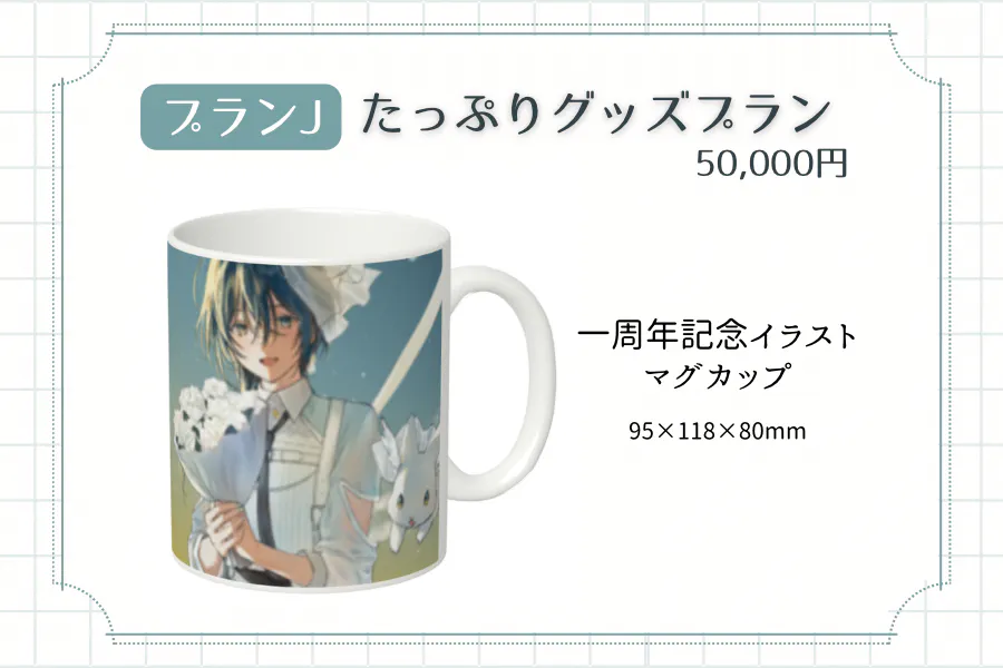 一周年イラストを使用したマグカップをメインにグッズ5点がセットでついてくるプランです