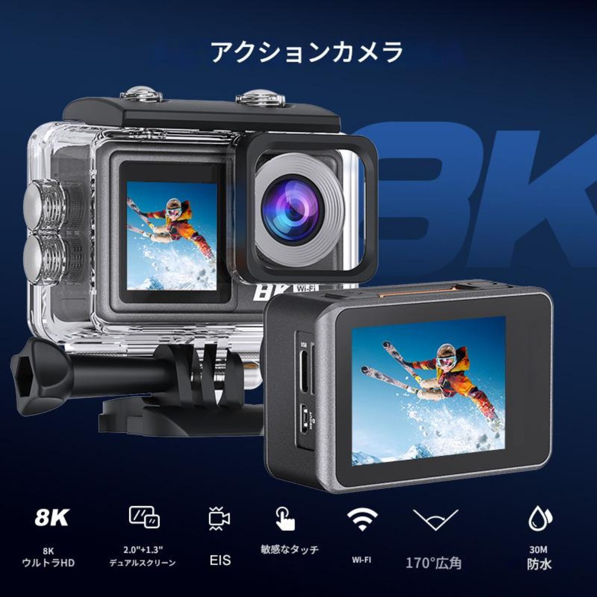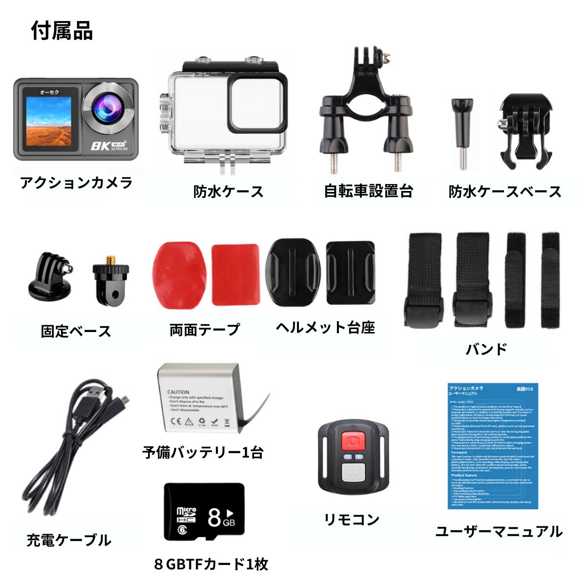 ※8Kアクションカメラ本体、8GBTFカード1枚、予備バッテリー含む