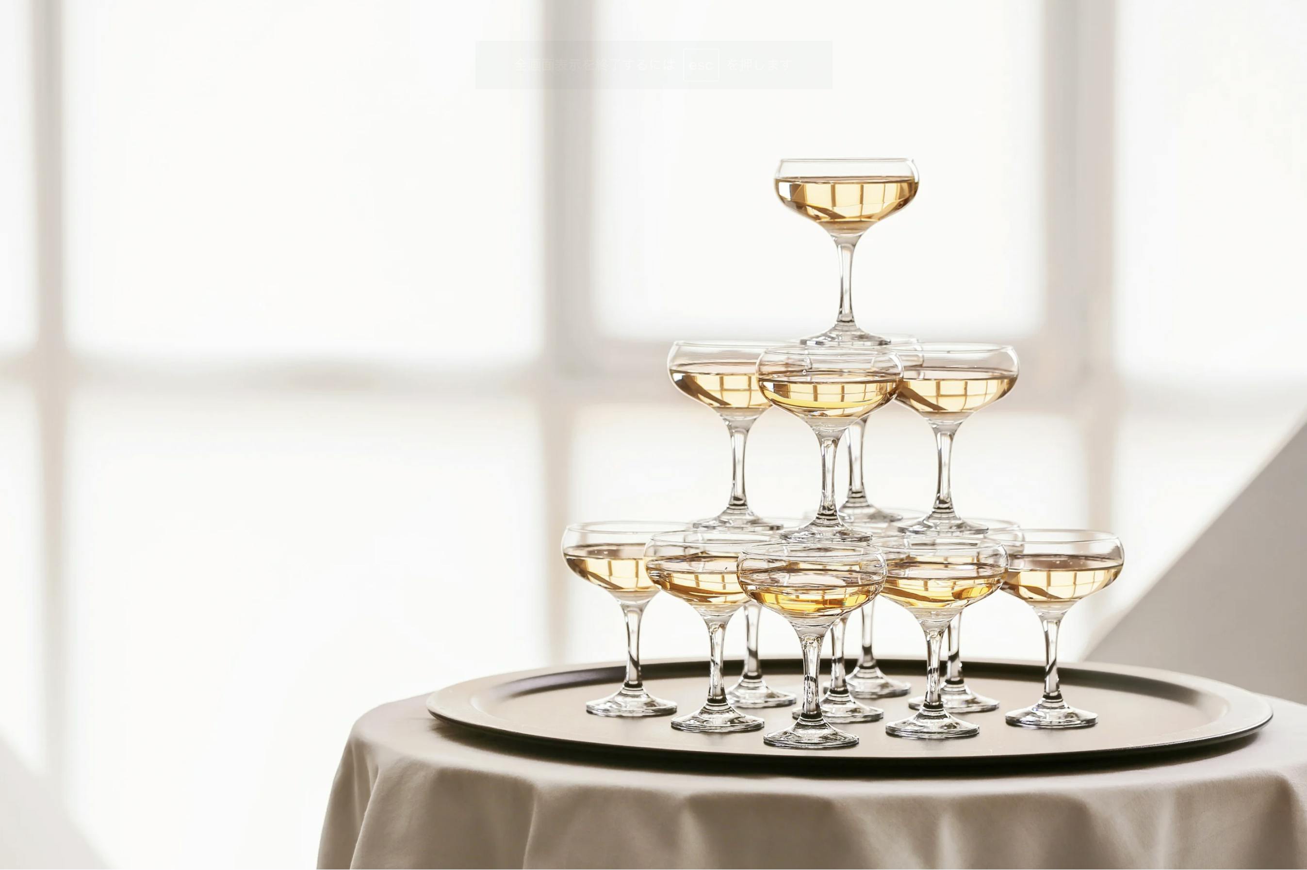 シャンパンタワーは、上のグラスから順に満たされていき、一番下のグラスまでシャンパンが満たせれます。