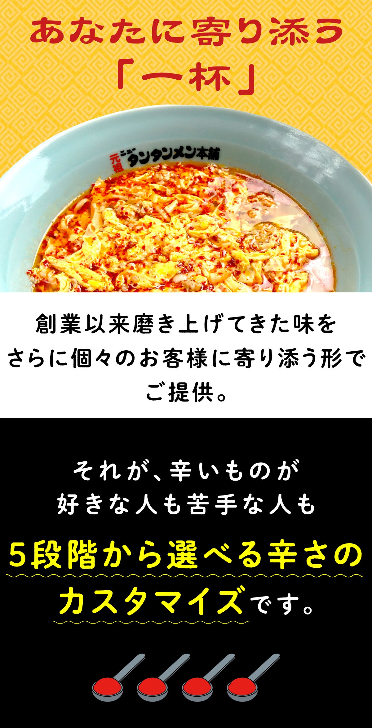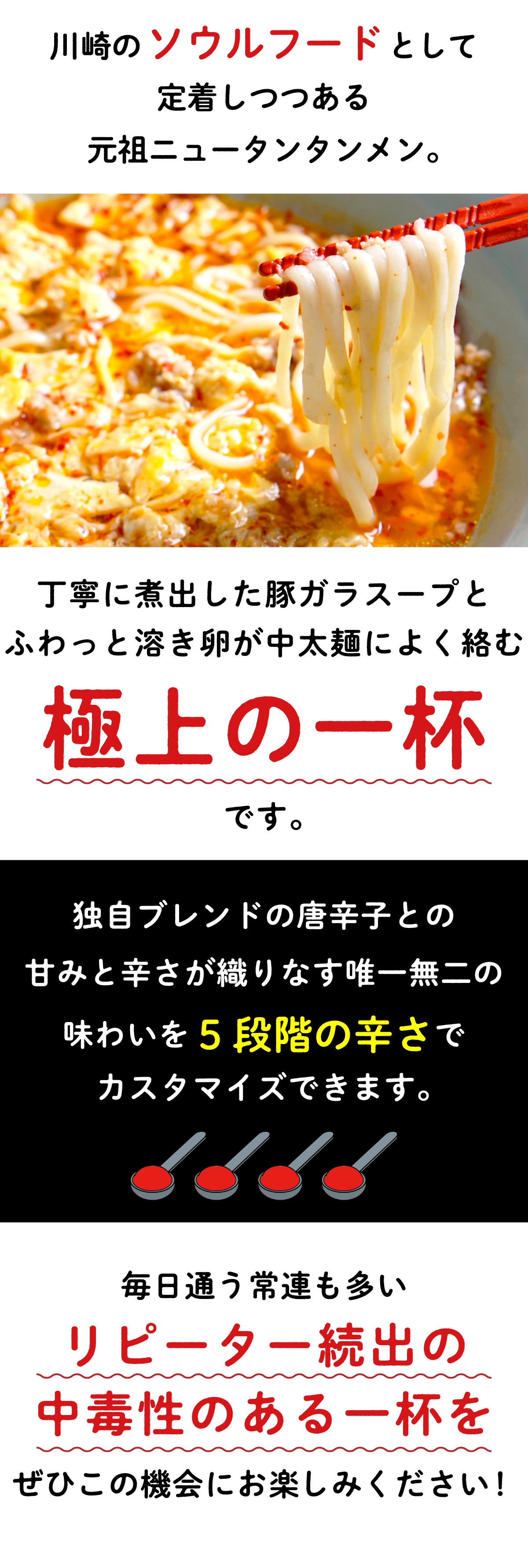 独自ブレンドした唐辛子特有の甘みが際立つ味わいは、辛さの中にも優しさを感じる独特な一杯です。