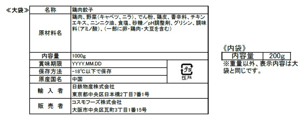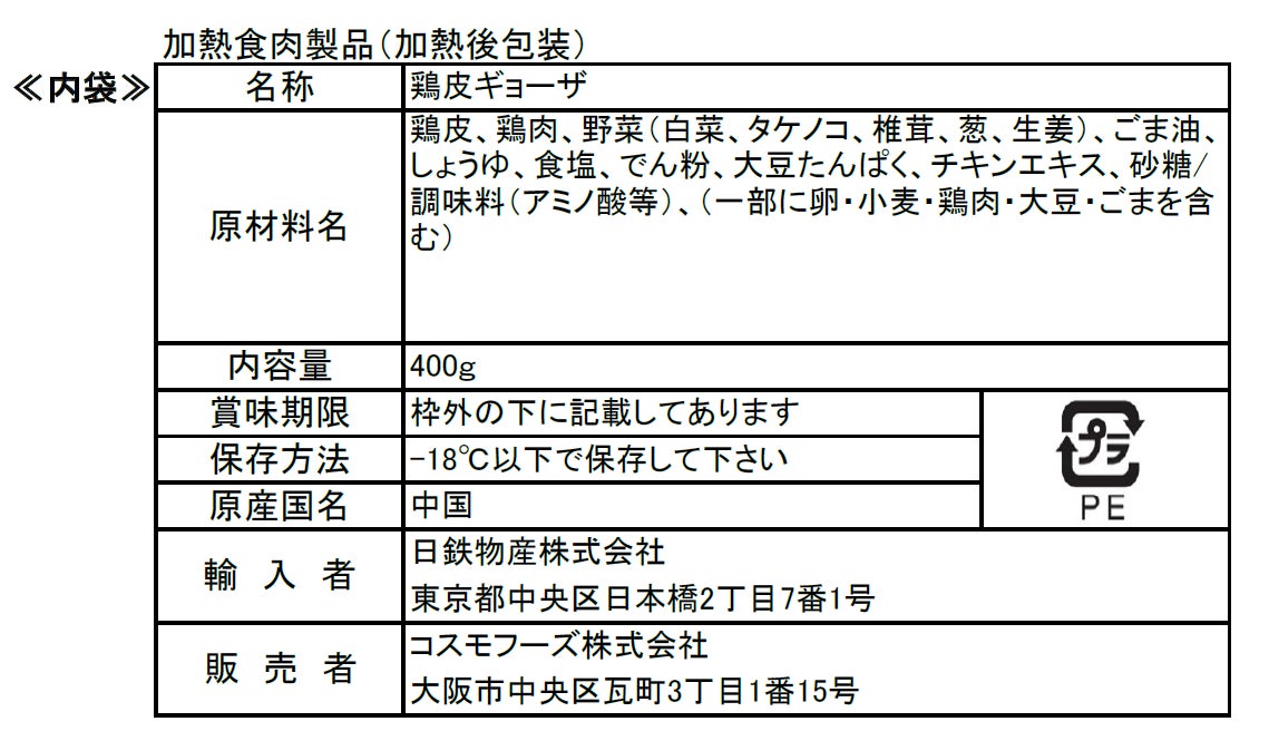 【原材料名】鶏肉、野菜(キャベツ、ニラ)、でん粉、鶏皮、香辛料、チキンエキス、ニンニク油、食塩、砂糖/pH調整剤、グリシン、調味料(アミノ酸)、(一部に卵・鶏肉・大豆を含む)