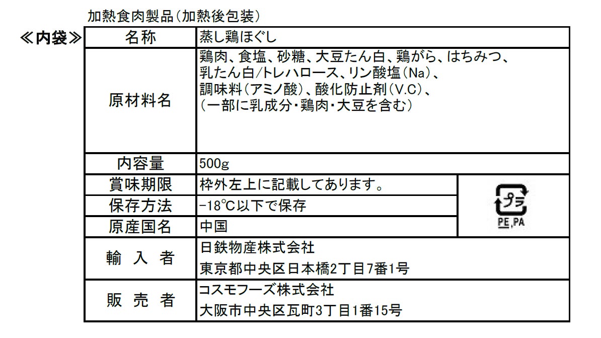 【原材料名】鶏肉、食塩、砂糖、大豆たん白、鶏がら、はちみつ、乳たん白/トレハロース、リン酸塩(Na)、調味料(アミノ酸)、酸化防止剤(V.C)、(一部に乳成分・鶏肉・大豆を含む)