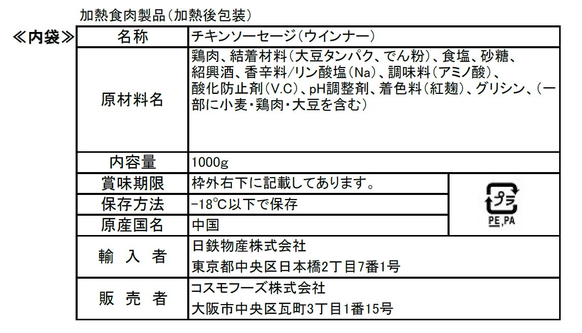 【原材料名】鶏肉、結着材料(大豆タンパク、でん粉)、食塩、砂糖、紹興酒、香辛料/リン酸塩(Na)、調味料(アミノ酸)、酸化防止剤(V.C)、pH調整剤、着色料(紅麹)、グリシン、(一部に小麦・鶏肉・大豆を含む)