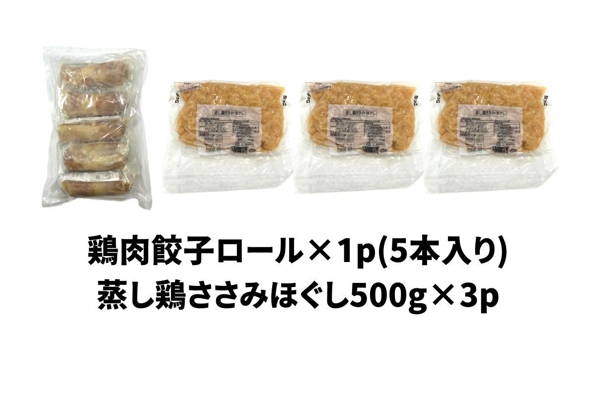【リターン商品⑤】→ 鶏肉餃子ロール1kgパック(200g×5本)×1パック + 蒸し鶏ささみほぐし500g×3パック