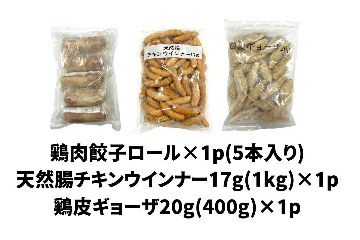 【リターン商品⑥】→ 鶏肉餃子ロール1kgパック(200g×5本)×1パック + 天然腸チキンウインナー17g(1kg)×1パック + 鶏皮ギョーザ20g(400g)×1パック