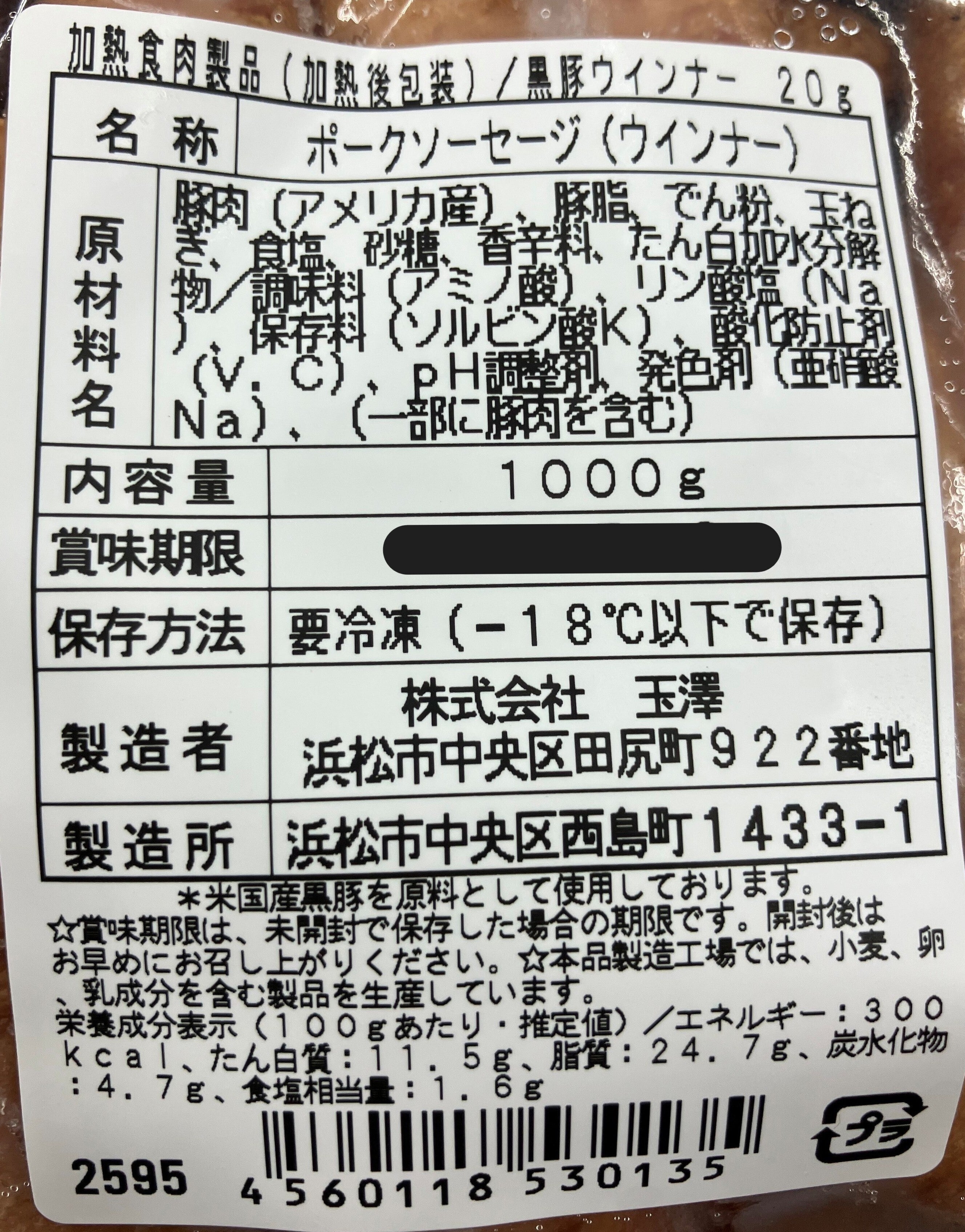 【原材料名】豚肉(アメリカ産)、豚脂、でん粉、玉ねぎ、食塩、砂糖、香辛料、たん白加水分解物/調味料(アミノ酸)、リン酸塩(Na)、保存料(ソルビン酸K)、酸化防止剤(V.C)、pH調整剤、発色剤(亜硝酸Na)、(一部に豚肉を含む)