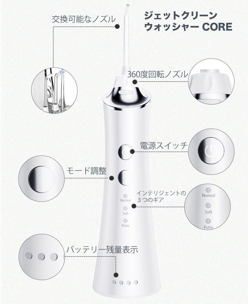 ジェットクリーンウォッシャーCoreは、ノーマルモード・ソフトモードのほか歯間洗浄だけでなく、歯ぐきを優しく刺激するパルスモードを搭載。