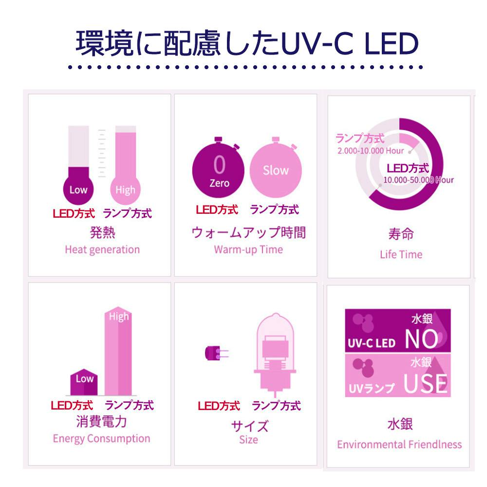 除菌のためのUV-Cは、ランプ式よりも環境に配慮・機能性に優れているLEDを採用しています。