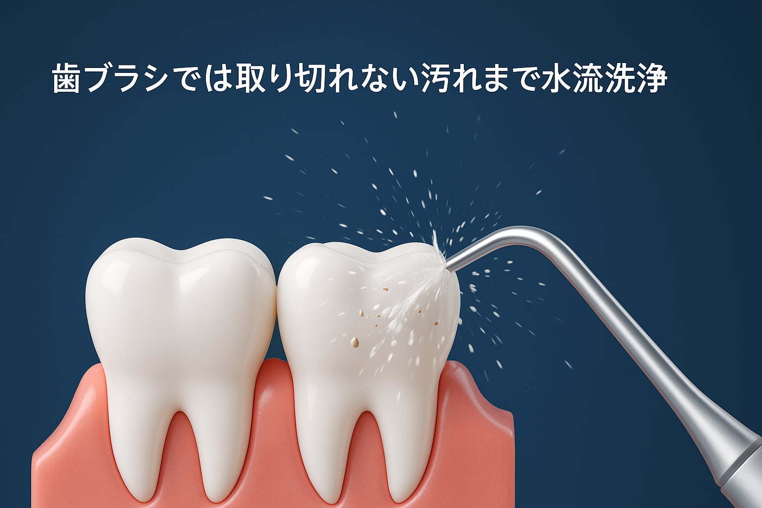 水流の力で、歯磨きでは取り切れない歯間に残った汚れを弾き飛ばします。