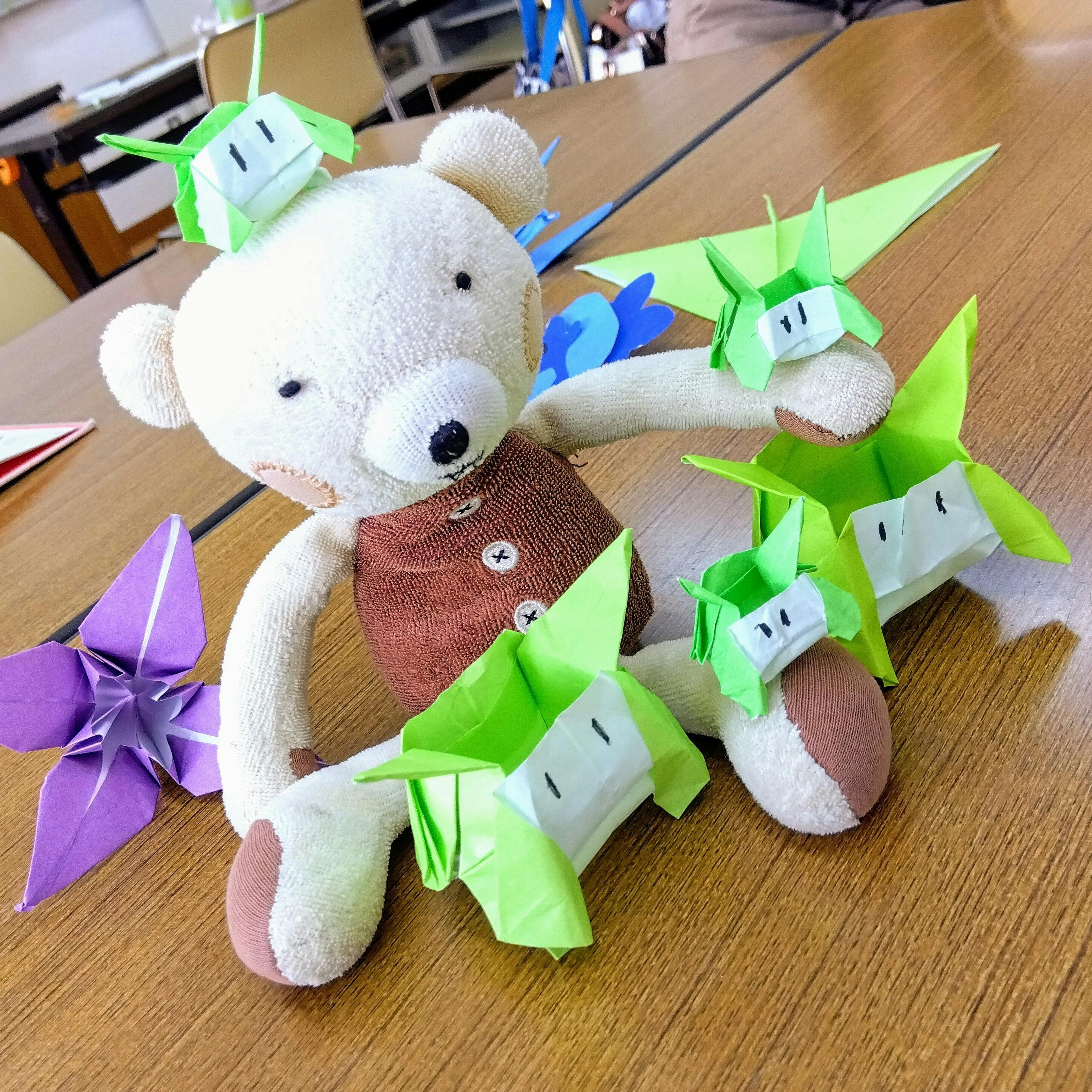 折り紙で作ったキャラクターは、大きいサイズがふたつ、小さいサイズが3つ