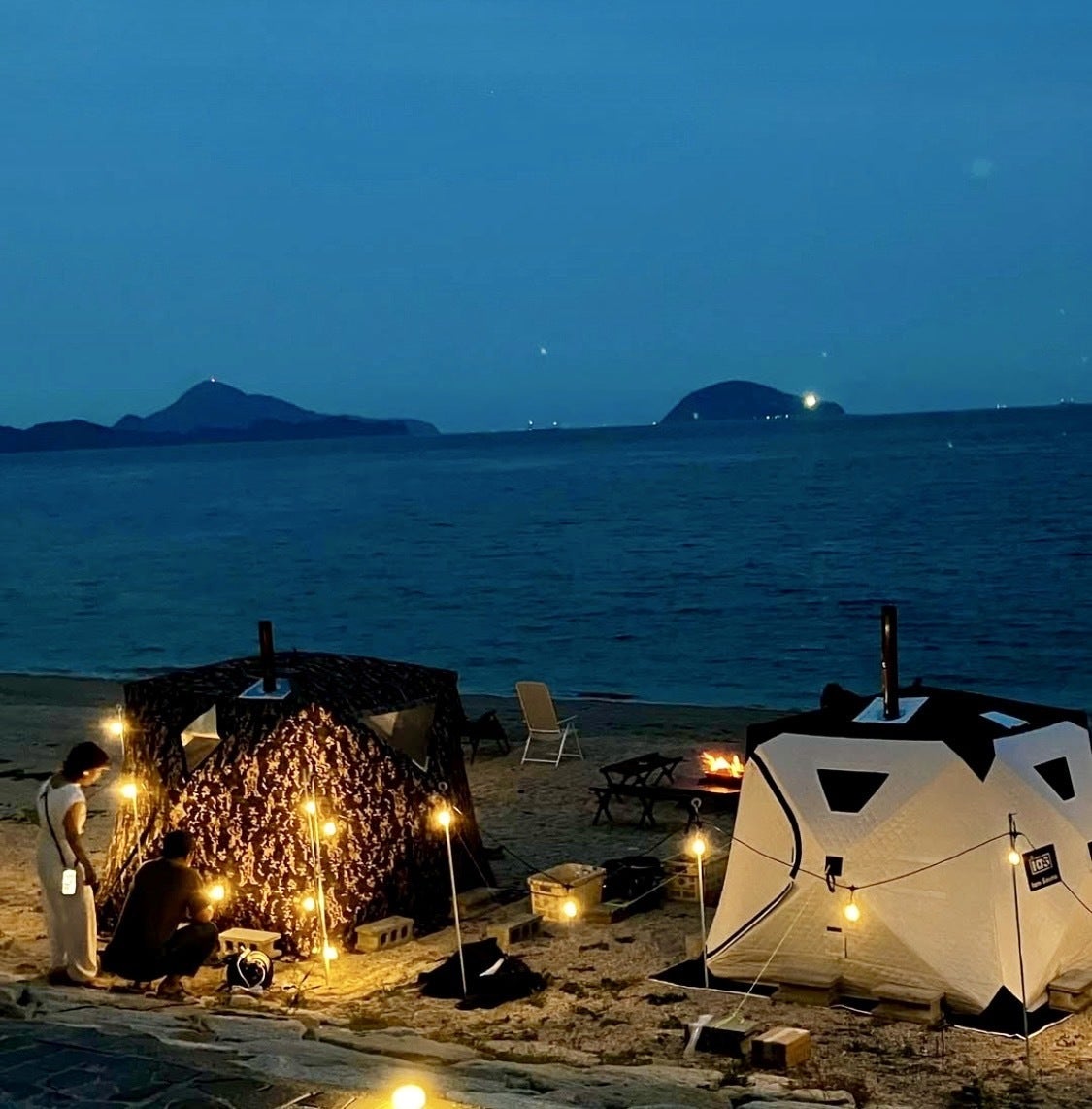 夕暮れ時には、島ならではの静寂とともに、瀬戸内の恵みを贅沢に味わうひとときへ。地元の海の幸、山の幸などを使い中島に由来のあるシェフが腕を振るい厳選されたワインや日本酒と共に極上のマリアージュをご堪能ください。夜には、満天の星が広がる幻想的な夜空の下での星空観察。さらに、中島特産の柑橘を使用したアロマオイルの優雅な香りに包まれながらのプライベートテントサウナで、深いリラクゼーションを体験いただけます。まるで時が止まったかのような至高の 「Chillの時間」 をご満喫いただける企画となっています。
