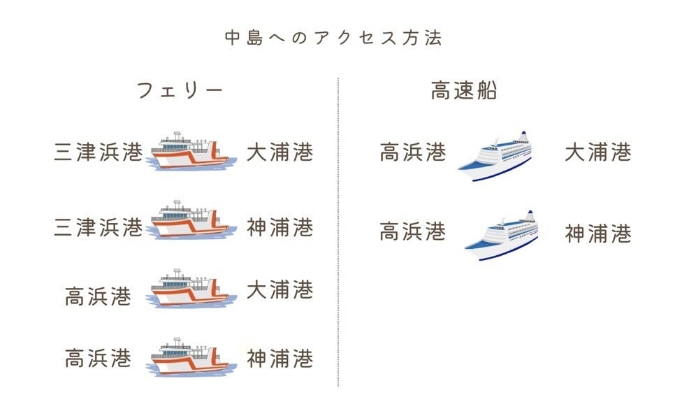 中島へは、松山市の三津浜港・高浜港・観光港の各港から、フェリーあるいは高速船でアクセスできます。大浦港あるいは神浦港で下船してください。