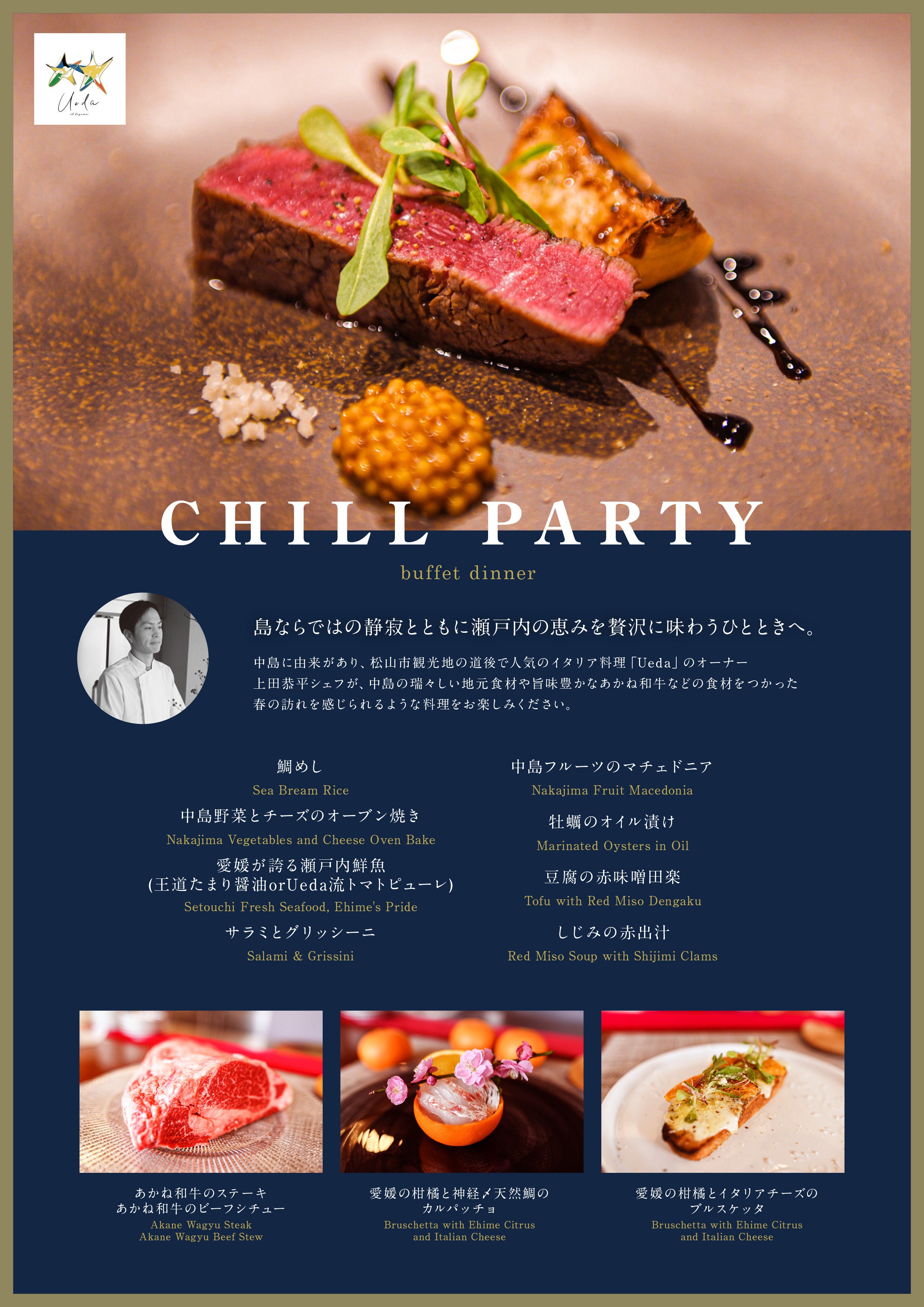 中島に由来があり、松山市観光地の道後で人気の「イタリア料理Ueda」のオーナー上田恭平シェフが、中島の瑞々しい地元食材や旨味豊かなあかね和牛などの食材をつかい腕を振るいます。春の訪れを感じられるような料理は目にも美味しく心弾む時間になるでしょう。