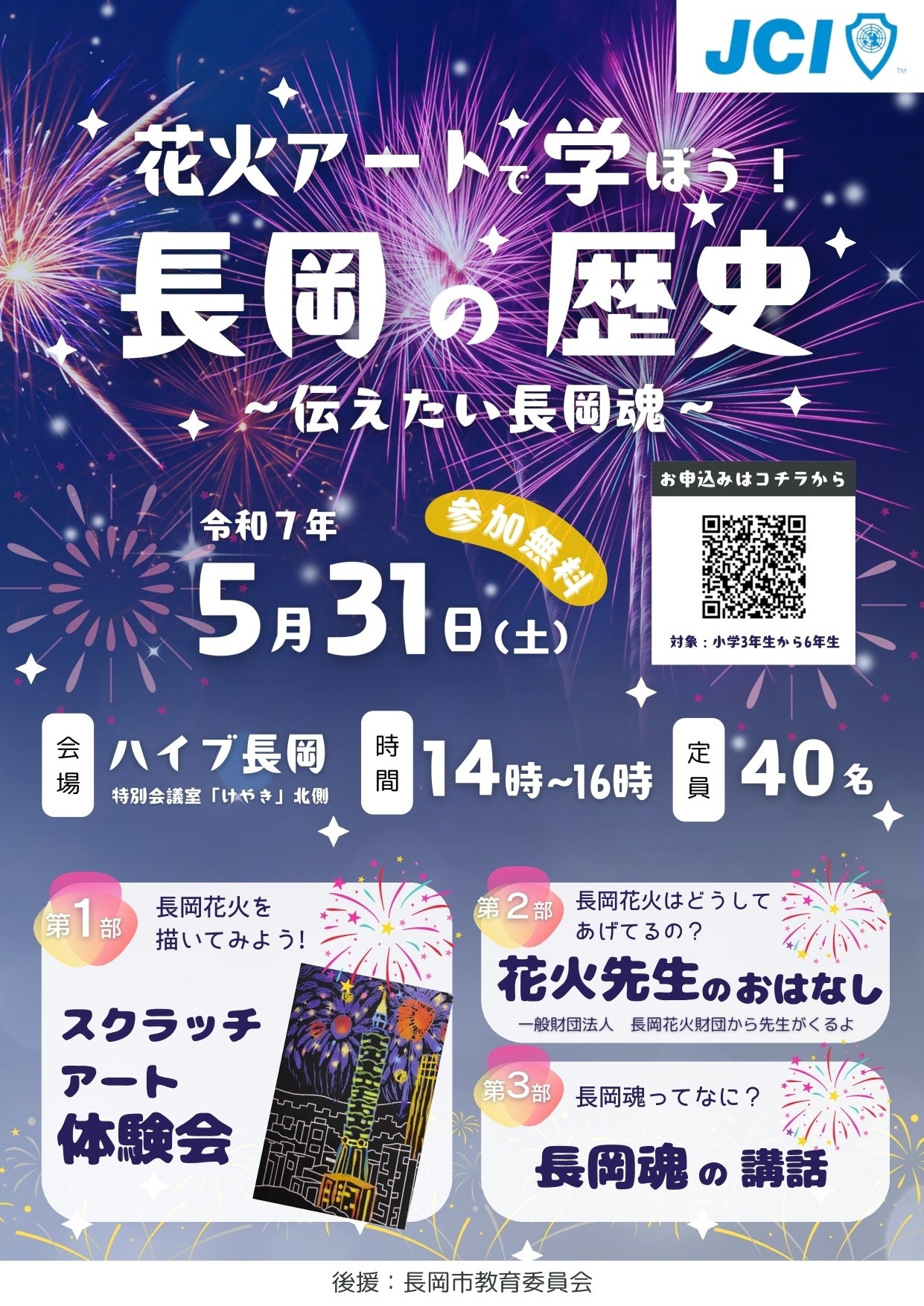 長岡の子ども達(小学3年生〜6年生)に、長岡花火に込められた意義や想いを知ってもらい長岡への誇りを持ち、将来大人になっても、長岡のまちへの想いを持ち続けてほしい。