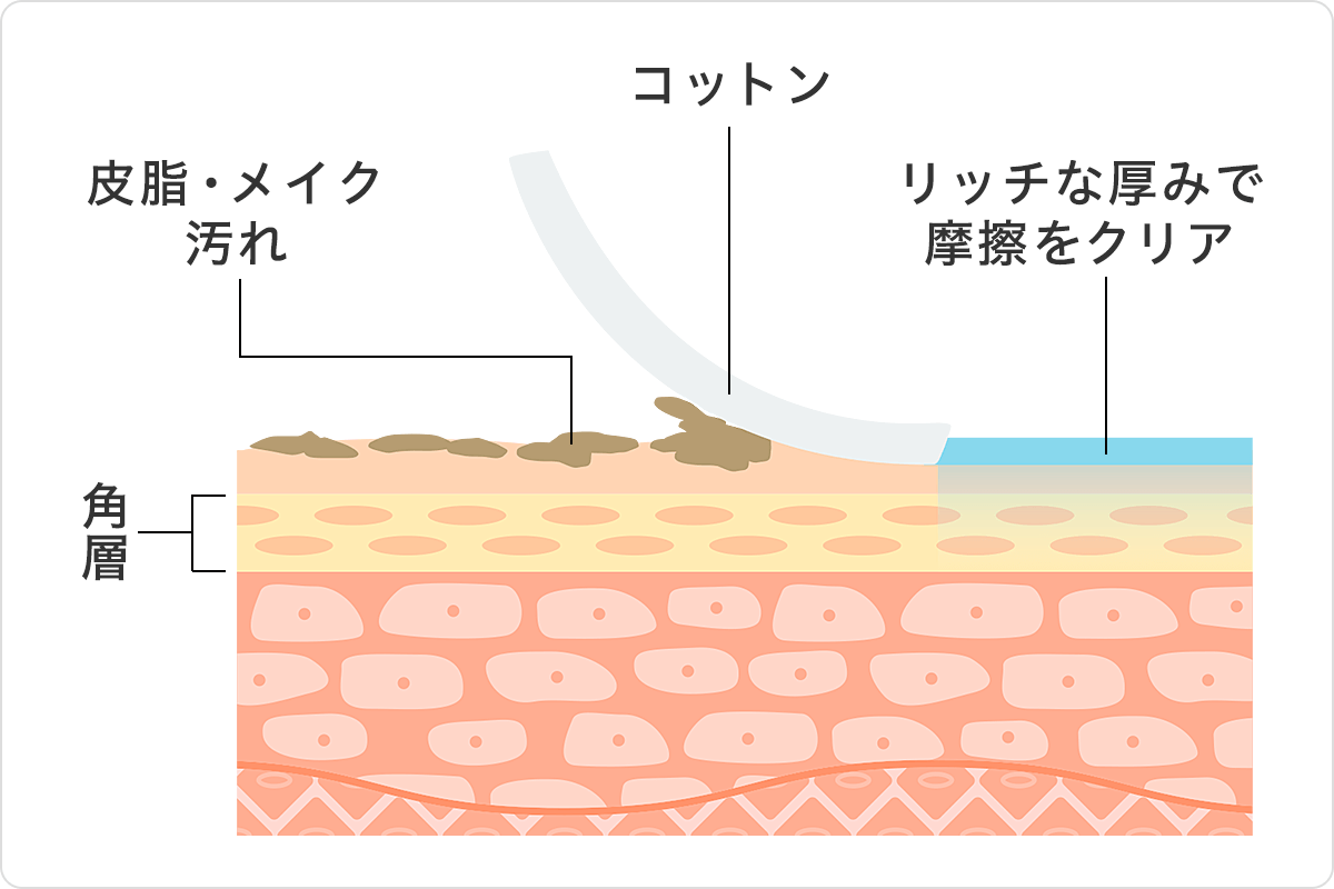トウモロコシ由来の厚みのあるオイルのような感触の保湿成分(メチルグルセルー10)と、保湿効果も持つ保湿型洗浄成分により、コットンと肌の間にリッチでするするとすべりやすい厚みをもたせ、摩擦負担をかけることなくメイクをオフ!