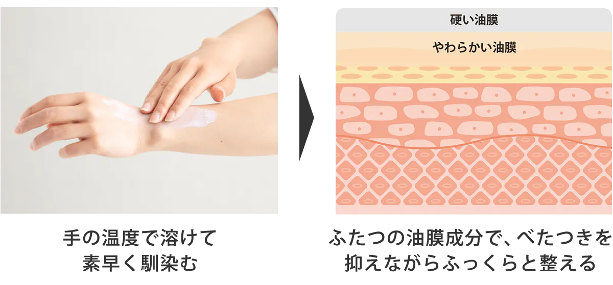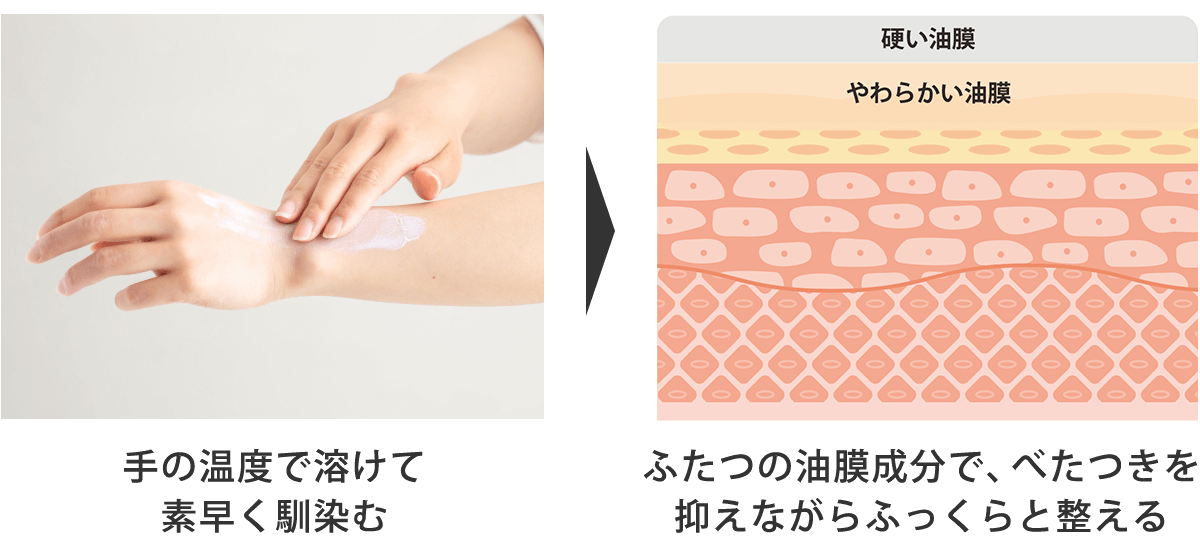 クリームがとろけるように素早く広がり浸透したのち、肌表面では油分が固化。