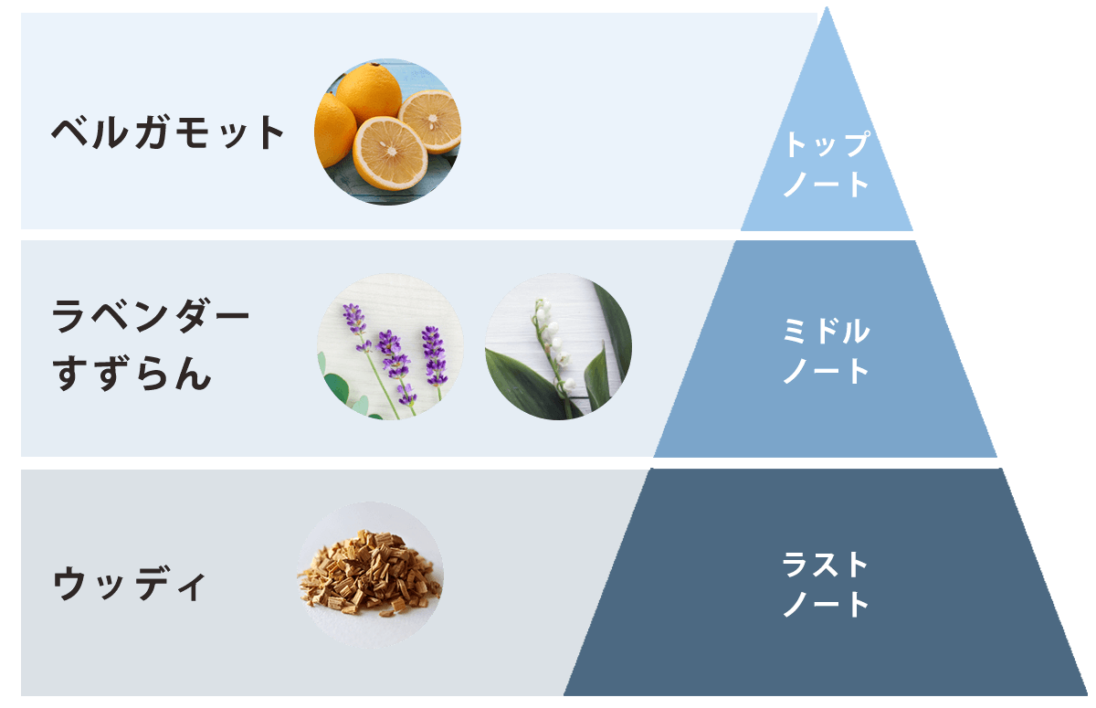 トップからミドルにかけてリラックスするベルガモット、ラベンダーが香り、ラストにかけてすずらん、ウッディの香りが集中力を高めていきます。
