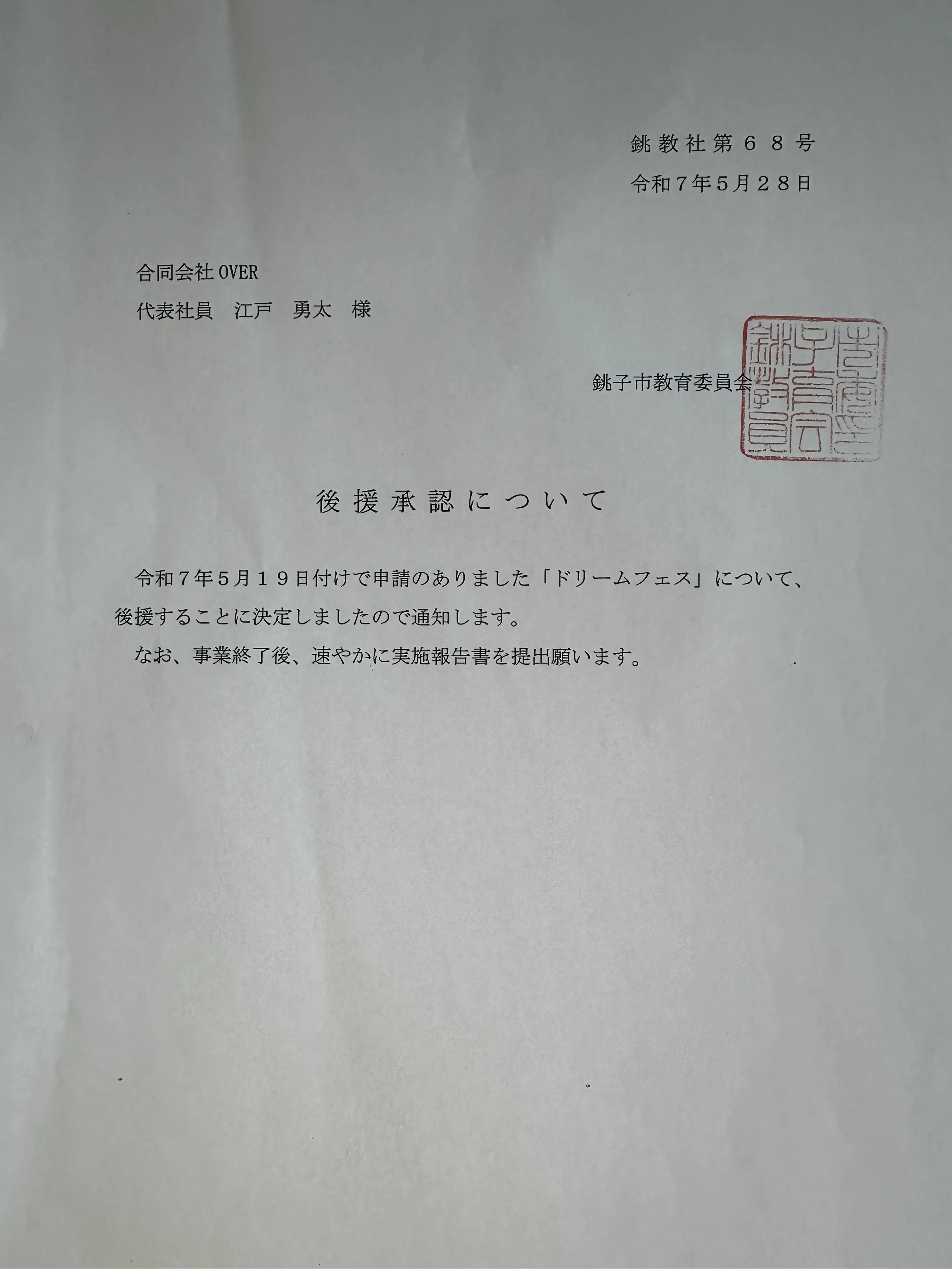 2025/06/05 16:58このたび、7月6日開催の「ドリームフェス」において銚子市教育委員会の後援をいただけることになりました。子どもたちの未来につながるイベントとして、より多くの方々に安心して楽しんでいただけるよう準備を進めてまいります。引き続き、ご支援・ご協力のほどよろしくお願いいたします! もっと見る