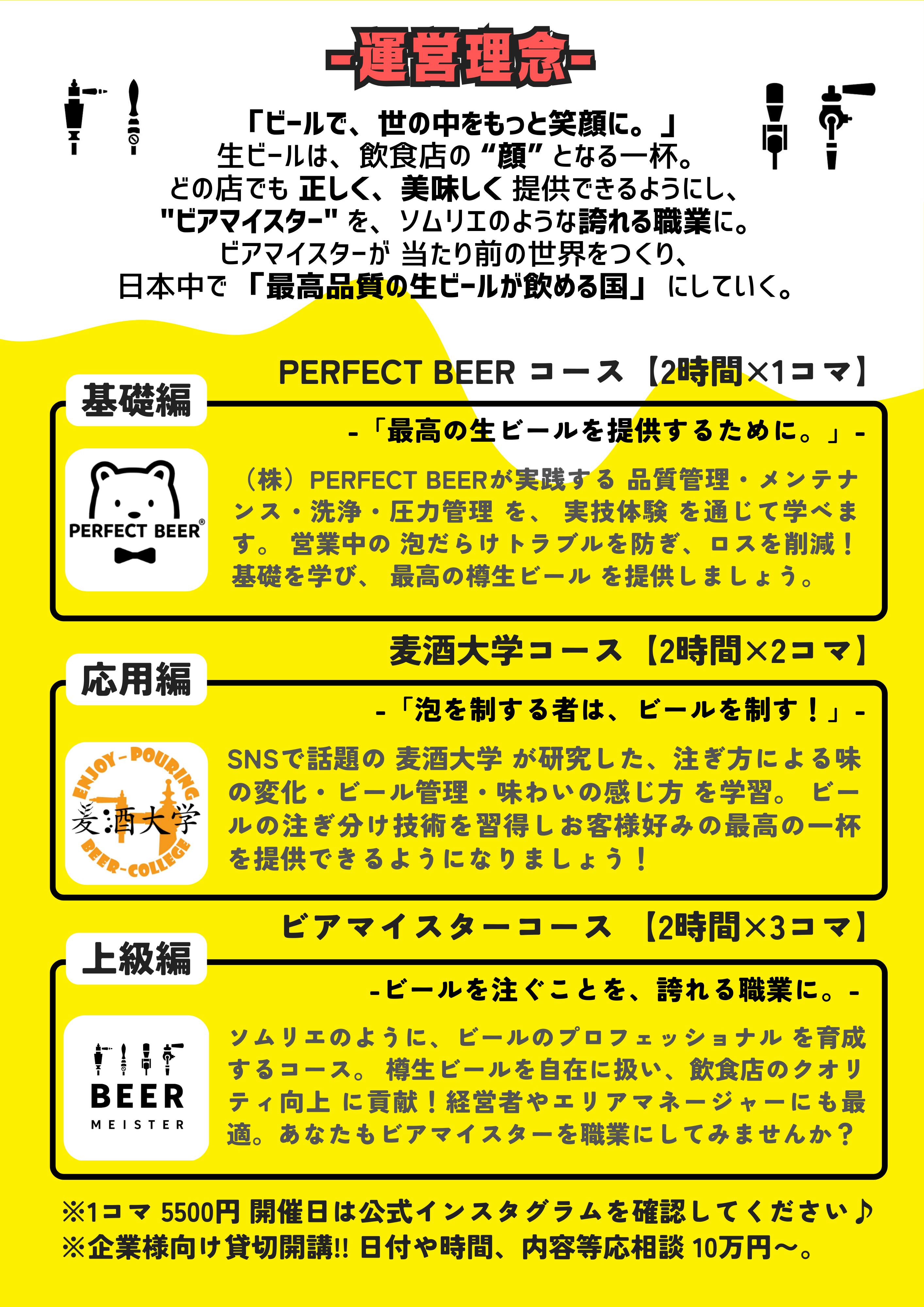 PERFECT BEER SCHOOL の開校を通じて、 日本中どこでも「最高のビール」が飲める世界」を実現したいと思っています。私たちは、ただビールを注ぐ技術を教えるのではなく、「美味しいビールが当たり前に楽しめる文化」 を日本全国に広めていきます。