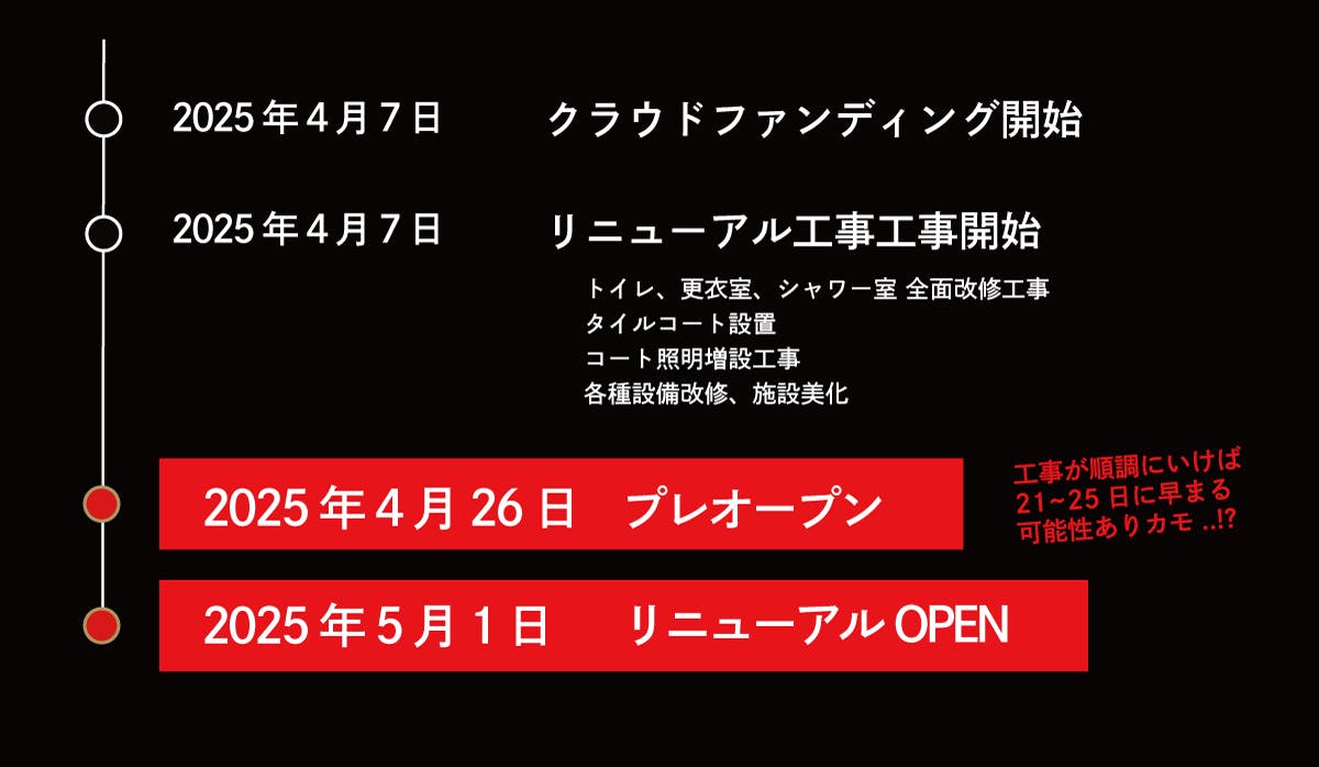 タイルコートの設置工事や、老朽化したクラブハウス(更衣室・トイレ・エントランスなど)の工事費用及び不動産契約費用を合わせて、約3000万円かかります。