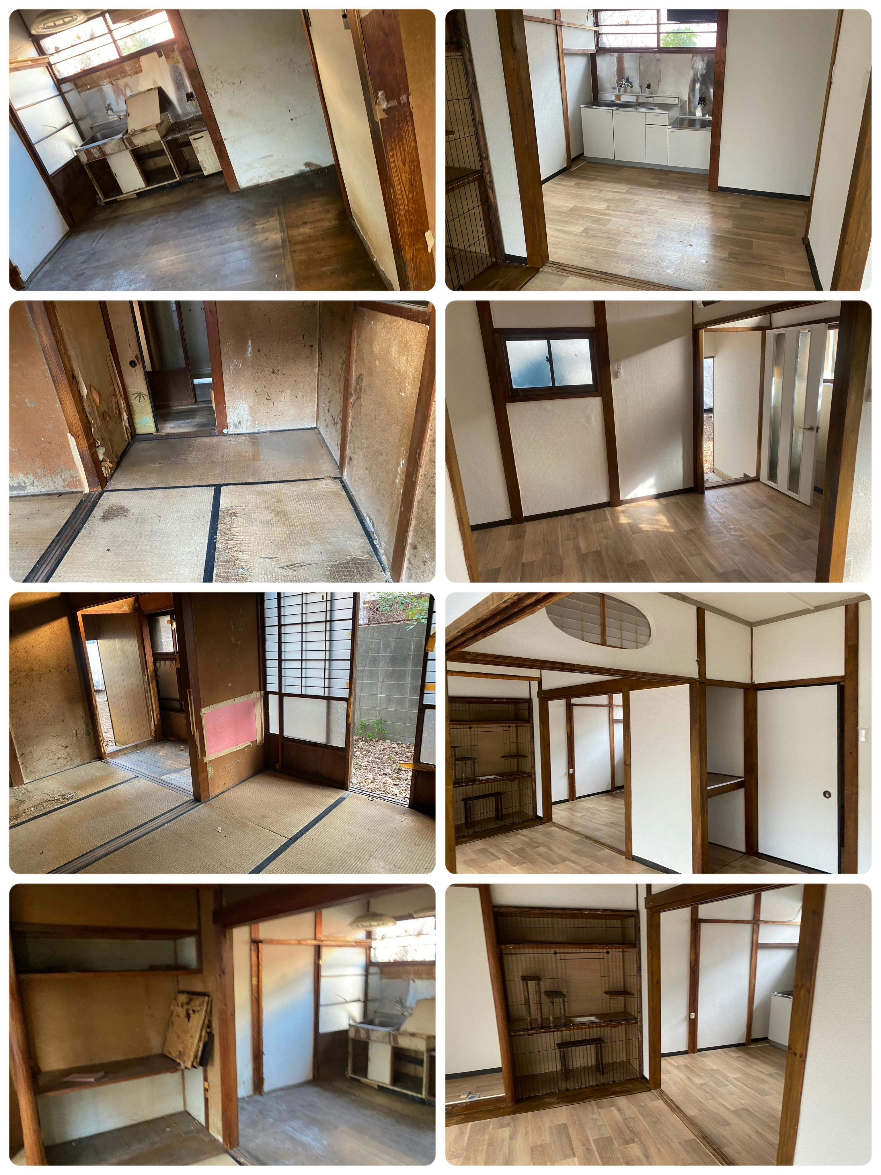 こちらの写真はシェルターのビフォーアフターです。古民家を借り上げて綺麗にしていただきました!実はこの作業はお店の賃貸契約と同時進行で始めていて1番最初に取り掛かっていました。前の猫カフェに在籍していた猫さん達の居場所確保の為です。閉店することがかなり切羽詰まった状態で聞かされてから悩んでる暇も考えている暇もなくとにかく進める!動く!でした。今は元々のスタッフとシェルター側、お店側にわかれて作業しております。猫さんもお店と元々のお店のバックヤード組がシェルター側でわかれておりみんなが縮こまることなくゆったり過ごせる環境作りをしている最中です。勿論!みんな元気に過ごしています。