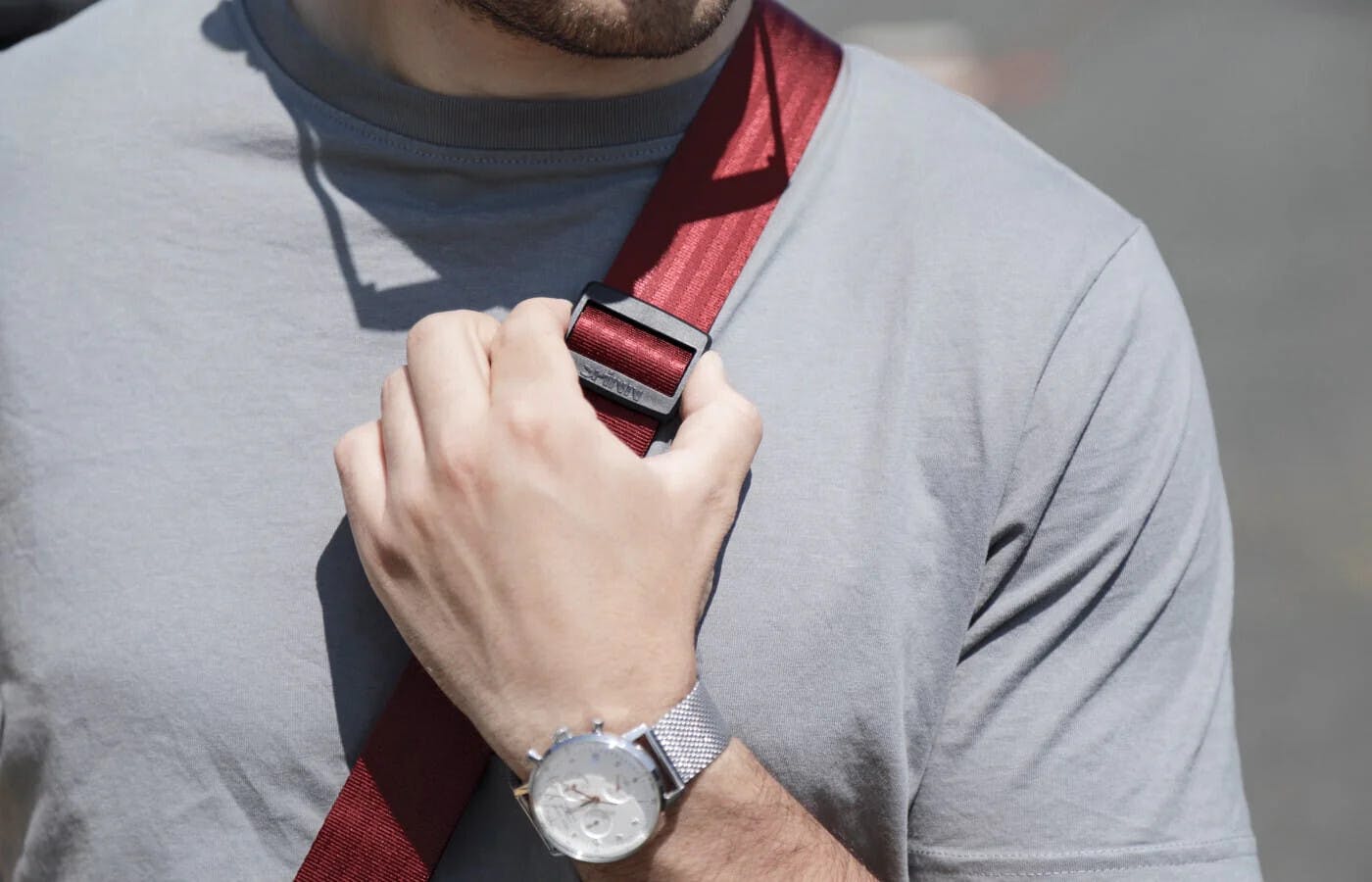 ストラップの表面がシートベルトと同様にツルツルで衣服に引っかからず、幅は38mmと広く、首や肩へのくいこみが少なく負担になりません。