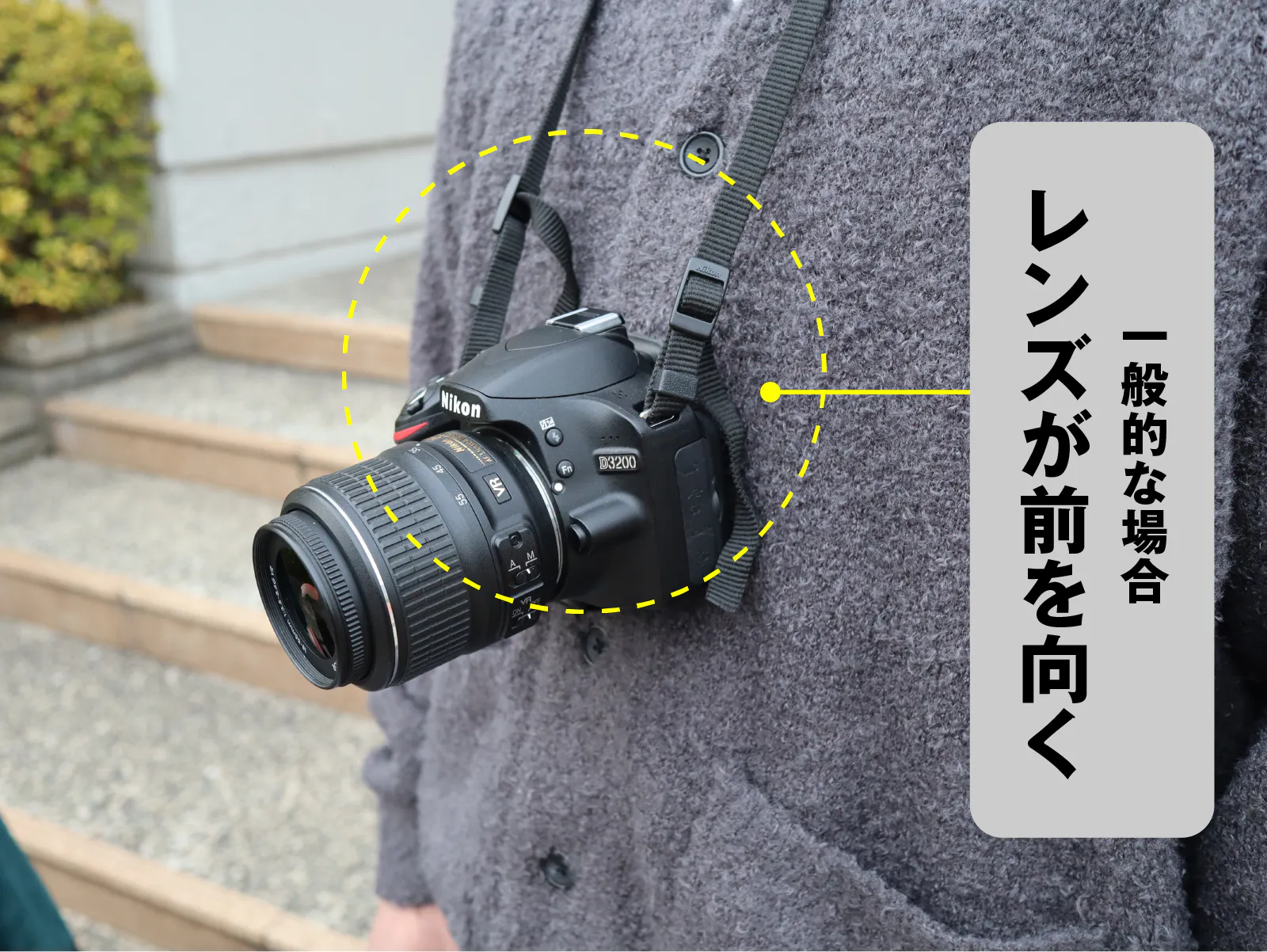 その場で撮影する時には便利ですが、首や肩にぶら下げながら移動する時はレンズが体の外側に向いてしまうため、安定感がないのが気になる人も多いはず。
