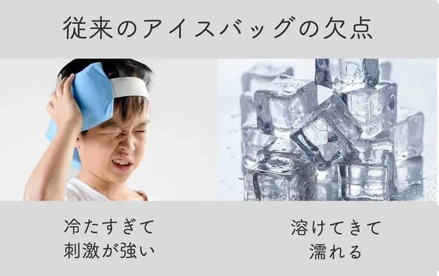 しかしながら、氷などを使うと、冷たすぎることで、過度に皮膚温度が下がってしまう可能性があり、温度調節が難しく、また溶け出してしまうため取り替えにも手間がかかります。