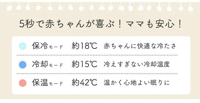 本製品で開発に開発を重ねた15℃/18℃の二段階の冷温計は、赤ちゃんに最適な温度で、赤ちゃんに安心で快適な睡眠環境を与え、快眠に導きます。