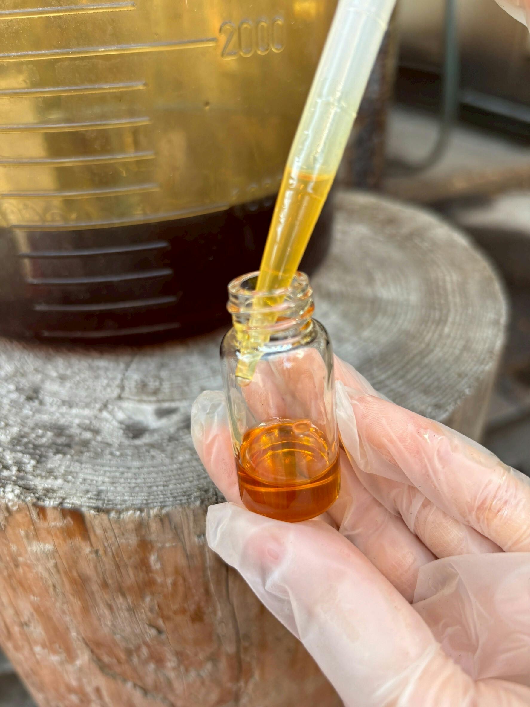先日、現地の深津製材所にて実際に抽出された「SUGI WOOD」のオイルを採取してまいりました。