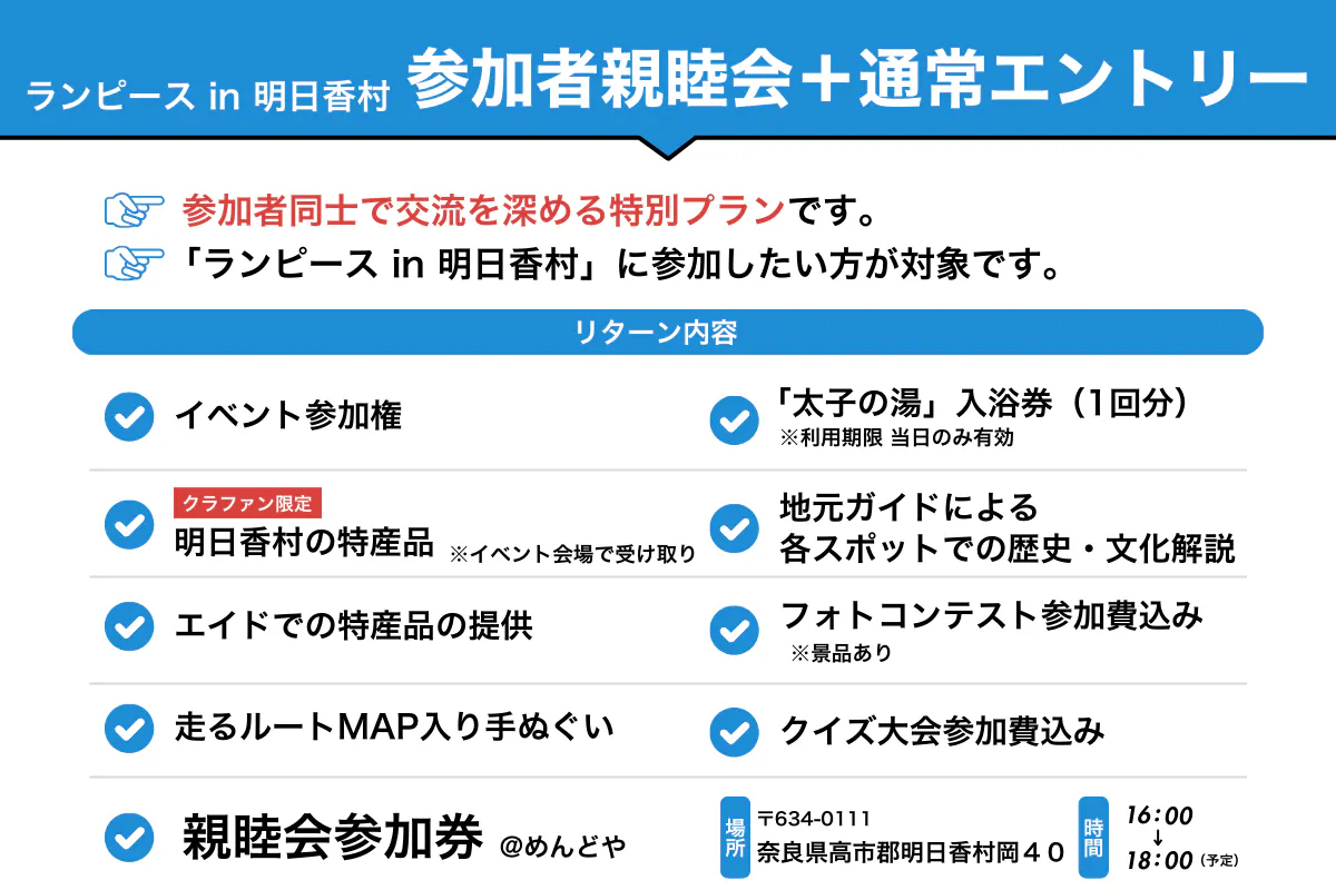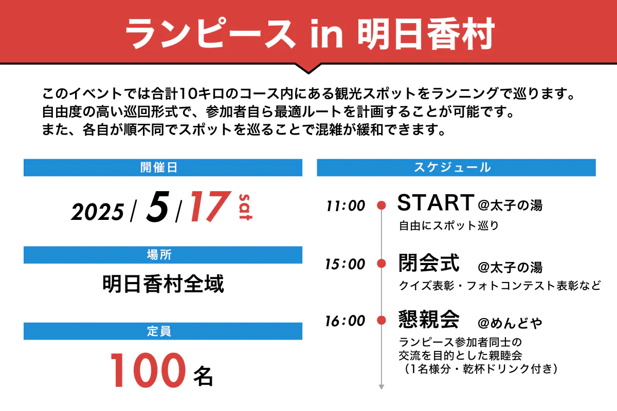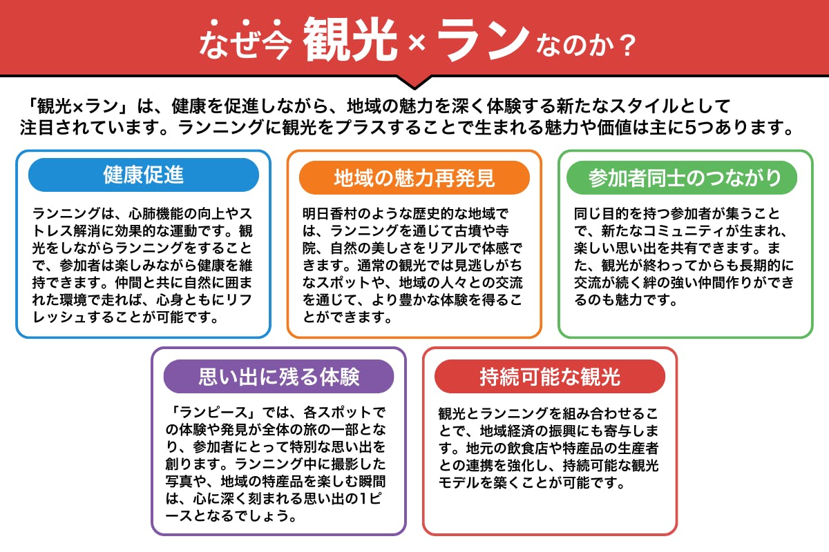 ランニングが好きな方はもちろん、明日香村に来てみたい方、新しい体験をしてみたい方にもおすすめのイベントとなっています。明日香村の魅力を通して、ひとつひとつのピースが心に残る特別な旅になること間違いなし!ぜひこの機会に、自由と知識、楽しさをつなぐ新たなランニング体験「ランピース」を体感してもらえたら嬉しいです。ご参加を心よりお待ちしております。
