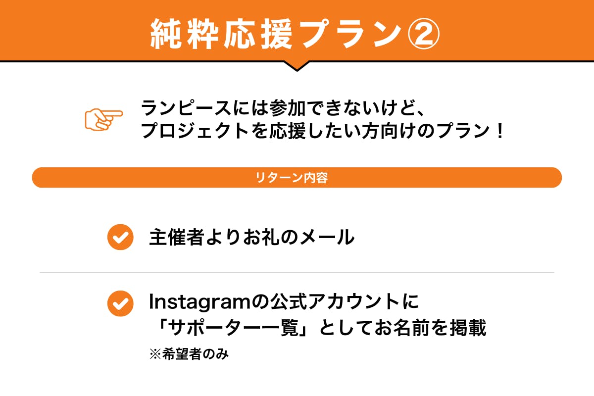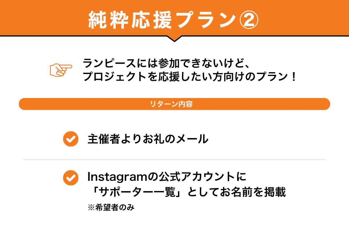 A: イベントには参加できないけれど、プロジェクトを応援したい方向けのプランです。お礼のメールや、Instagramの公式アカウントにお名前を掲載するなどの特典があります。