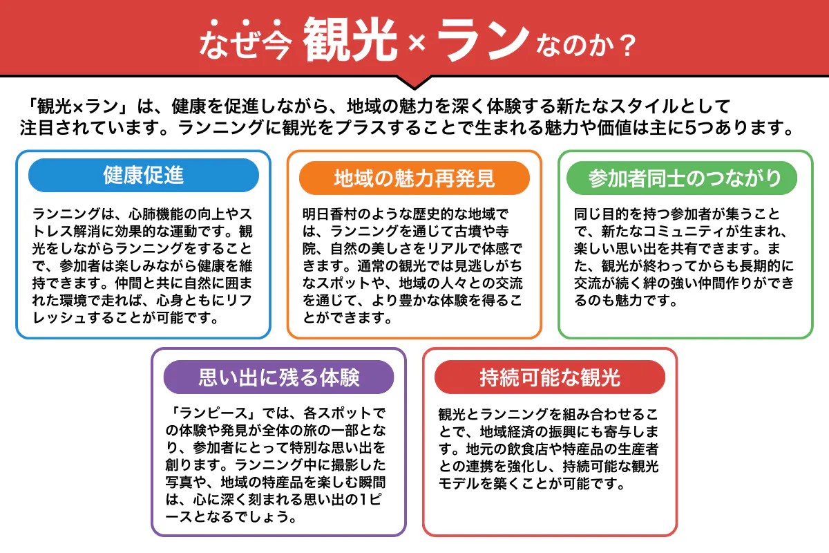 こうした状況下で地域の振興・活性化・持続的発展を目指すためには、観光資源を効果的に活用し、地域の価値を再発見するとともに、広く認知してもらい、地域へ実際に足を運んでもらうことが重要です。そこで私たちは、観光や健康促進をテーマにしたイベントを通じて、地域の魅力を広めたいと考えています。その第一弾が奈良県の明日香村です。