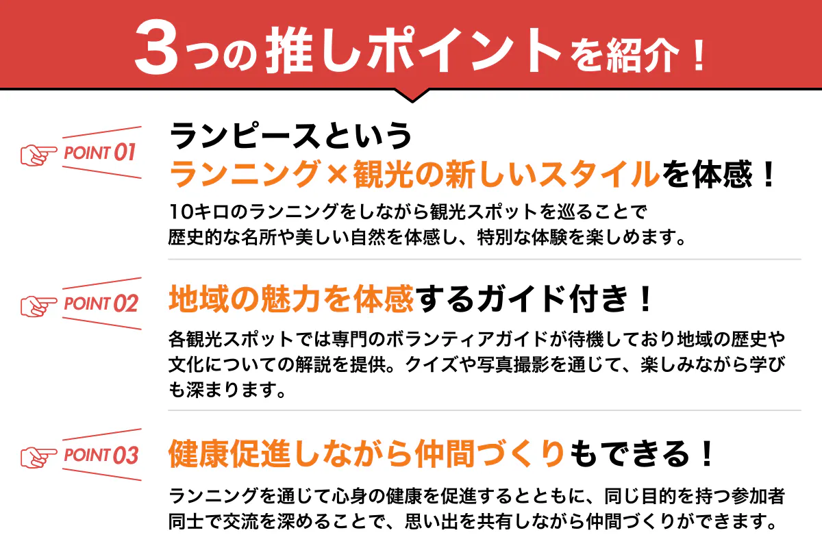 A: ランニングと観光を組み合わせた新しいスタイルのイベントです。歴史や文化を感じながら自由にスポットを巡り、地域の魅力を再発見できます。