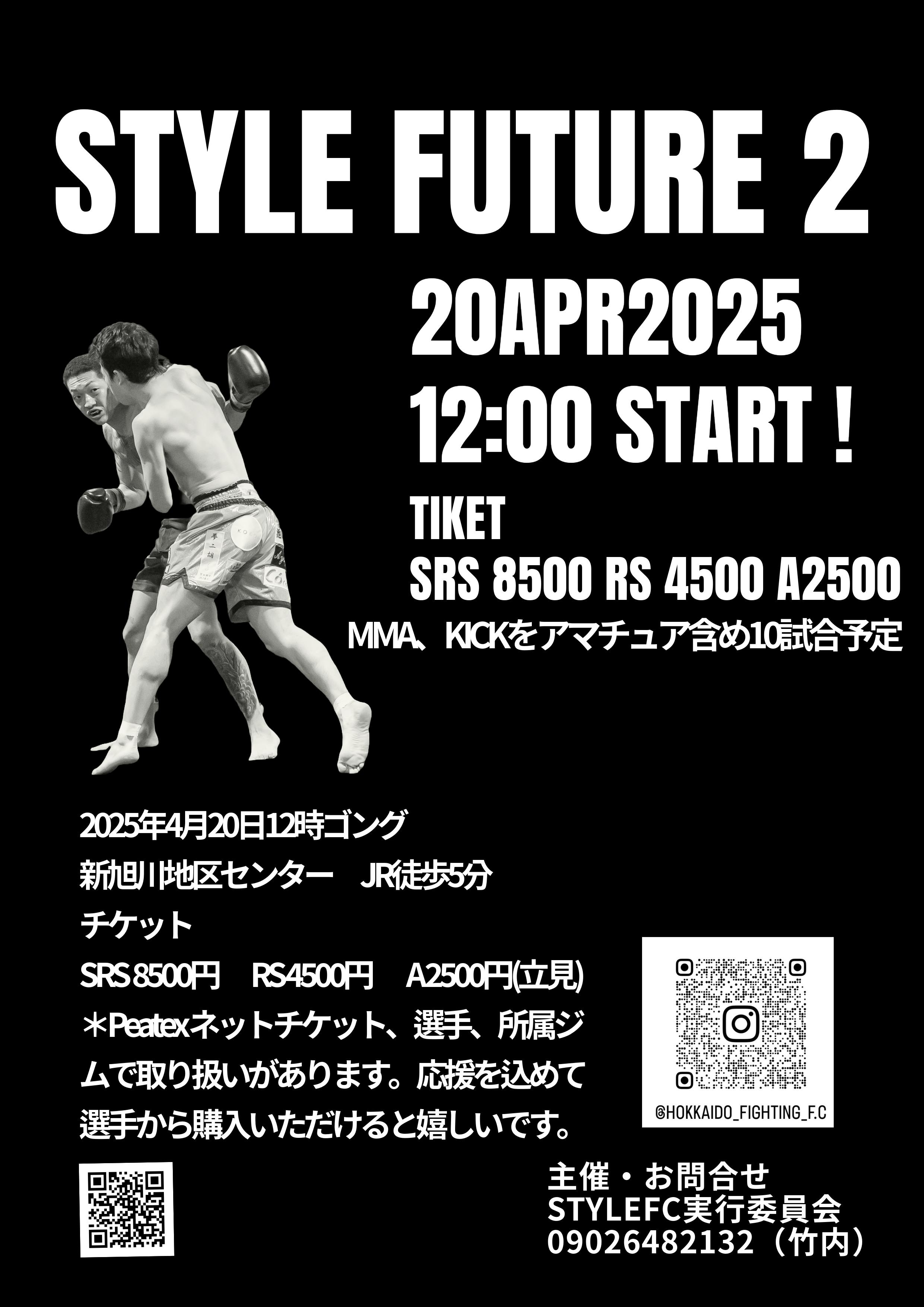 久しぶりの活動報告です。STYLE FUTURE は格闘技選手の実践の場として高いレベルで将来活躍できる選手を育成する大会です。今回で2回目の大会です。前回大会のメインをKO勝利で飾った林選手が4月20日大会も出場。今回もその激しいファイトで大会を盛り上げてくれるでしょう。[大会情報]大会名: STYLE FUTURE 2日時: 2025年4月20日12時試合開始会場: 新旭川地区センター入場券 SRS 8500円 RS 4500円 A 2500円(立見)*出場選手、所属ジム、Peatex ネットチケットから御購入ください。