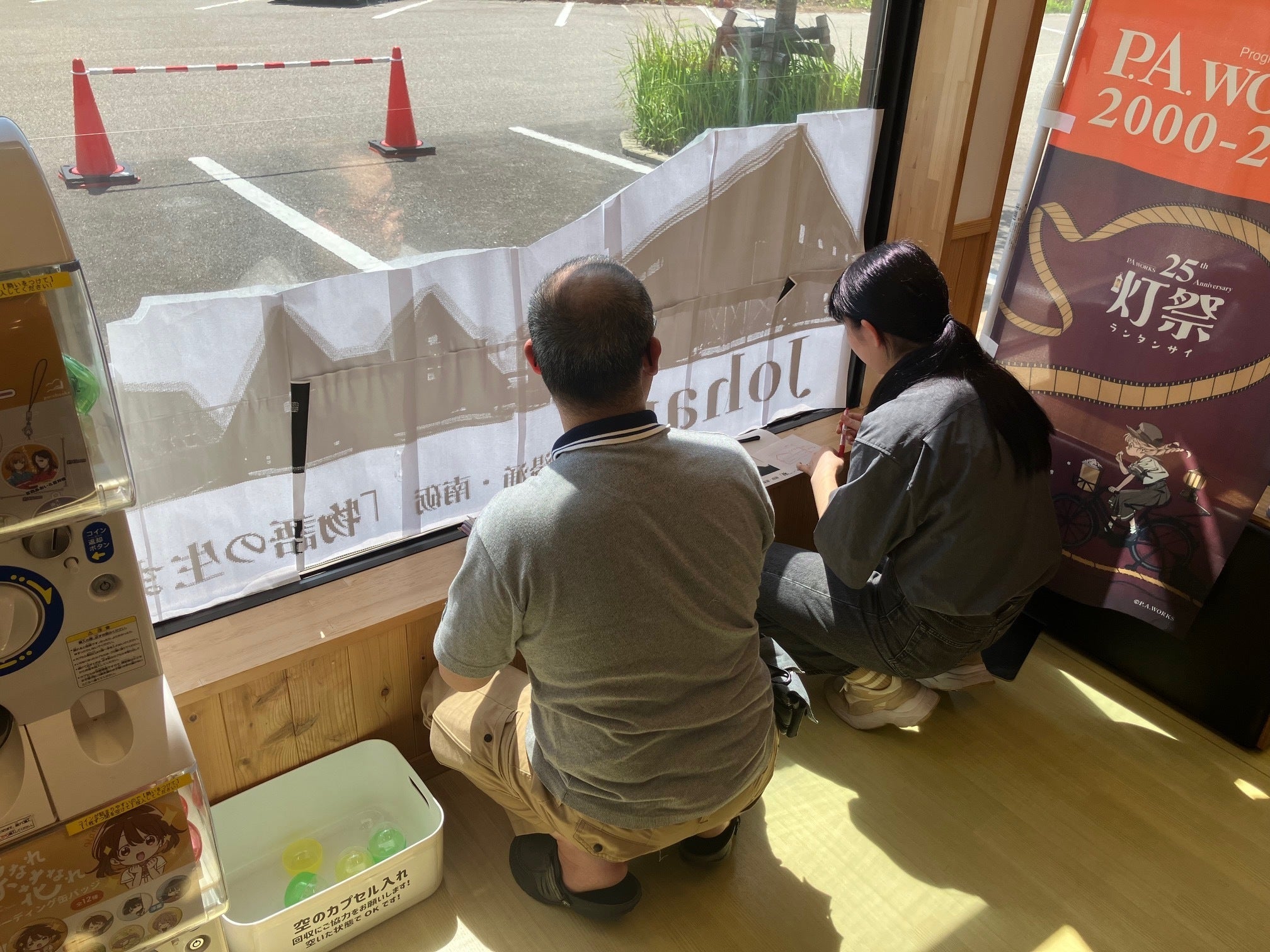 支援者の皆様、お気に入り登録をしてくださっている皆様いつも応援ありがとうございます。parubooksの佐古田です。クラウドファンディングも残り10日を切り、いよいよラストスパートの時期になりました。ストレッチゴール③1,500万円まで残り120万円余り、リターンも残り少なくなってきましたが皆様からのご支援が必要です。↓のバナーは自由にダウンロードいただいてかまいませんので、SNSなどでの呼びかけにお使いください。先日、ストレッチゴール②で実現した、「P.A.WORKS25周年記念撮影フレーム【仮称】」製作のため、設置場所でのイメージすりあわせを行いました。当日は南砺市の伝統工芸・井波彫刻の彫刻師の方に、設置場所の南砺市クリエイタープラザまでお越しいただき、事前にお渡ししていた仮のイメージ図を実寸大に引き延ばした紙を、設置予定の窓枠に貼り付け、微調整していきます。写真参考なども使いながら、どのくらいのディテールで彫刻を施すか、写真そのままではなくデフォルメした方がいいか、窓枠にはめこむためのアタッチメントの形状など、イメージを考えたスタッフと彫刻師さんとですりあわせていきます。フレームのコンセプトが、「施設が休みの時でも外からの写真撮影に使える」なので、大きな窓を備えた施設内のショップ「parubooks」の窓の内側に、ガラス越しに設置することにしました。ピーエーワークスさんの社屋外観、南砺市クリエイタープラザの外観を迫力ある彫刻で再現。加えて城端サービスエリアに来たことがわかる「Johana」の文字と、お隣の金沢市湯涌温泉さんと協力して2021年から「速旅ドライブプラン」造成などで継続しているプロジェクト「湯涌・南砺 物語の生まれる里」を彫っていただきます。今は黒い窓枠部に、カッティングシートなどで木枠色を施し、10/19の灯祭までにフレームを完成させるべく奔走中です。ご期待ください!
