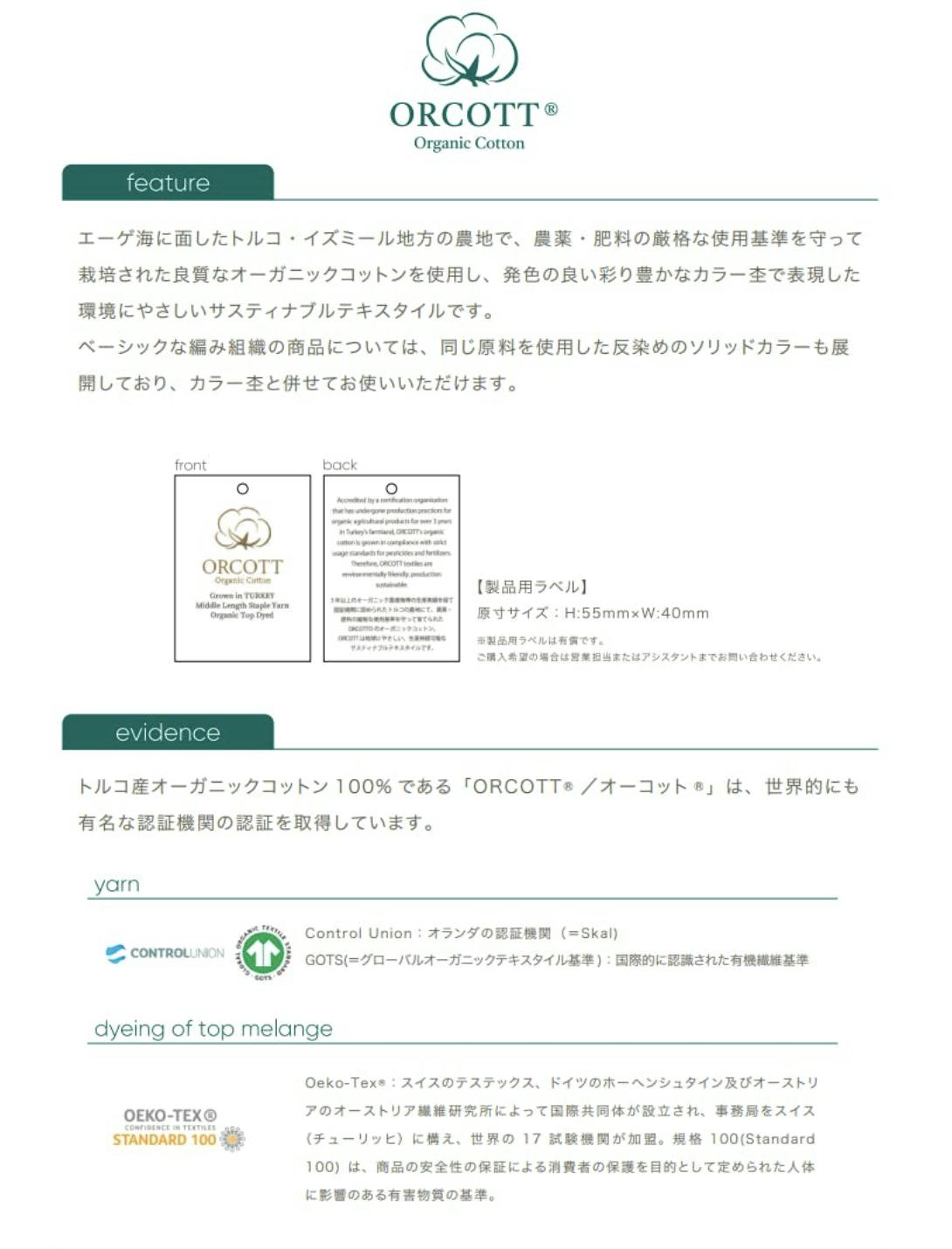 3年以上のオーガニック農産物等の生産実績を経て認証機関に認められたエーゲ海に面したトルコのイズミール地方農地で、農薬・肥料の厳格な使用基準を守って栽培された良質なオーガニックコットンを使用し、発色の良い彩り豊かなカラー杢で表現した環境にやさしいサスティナブルテキスタイルです。