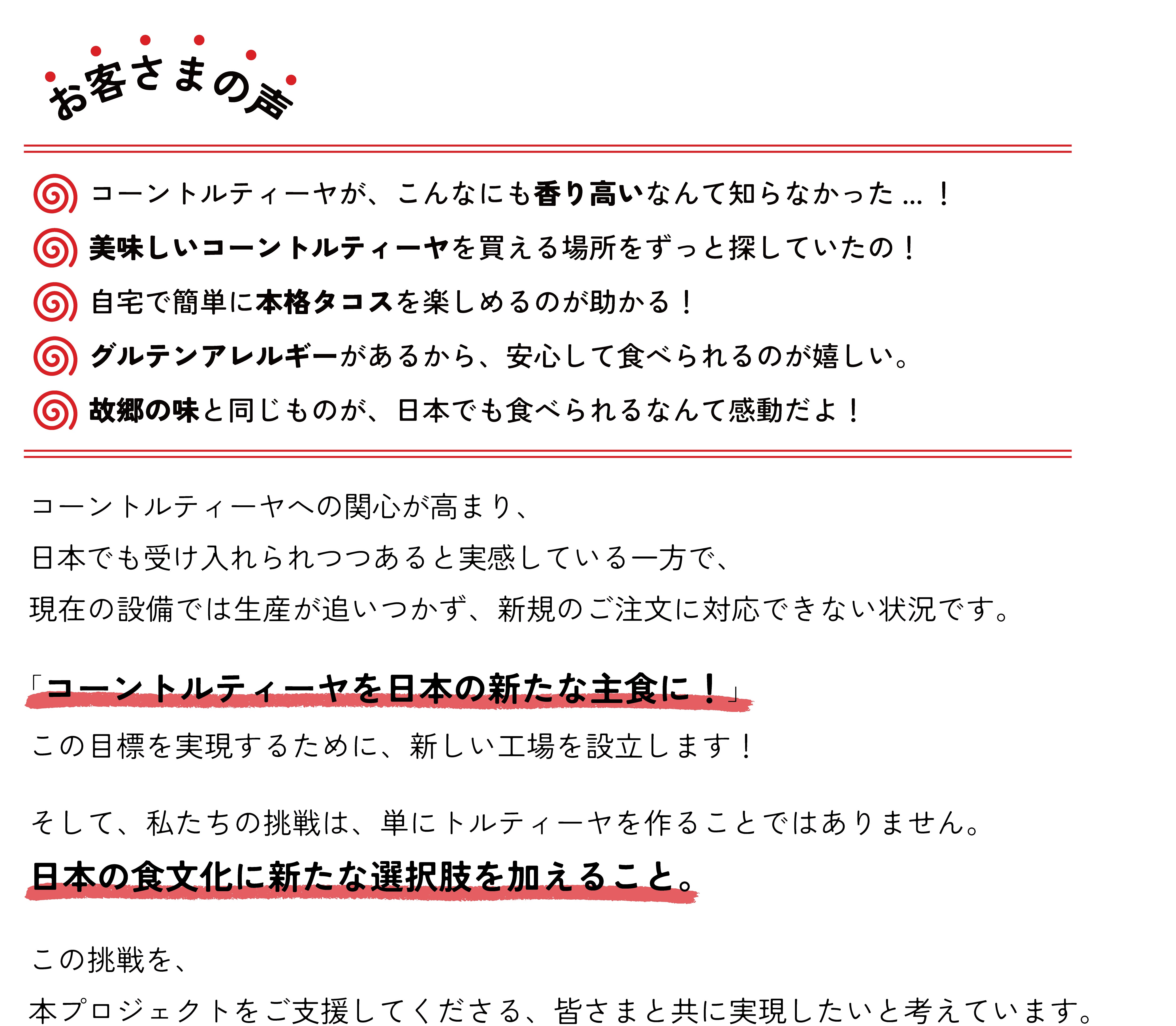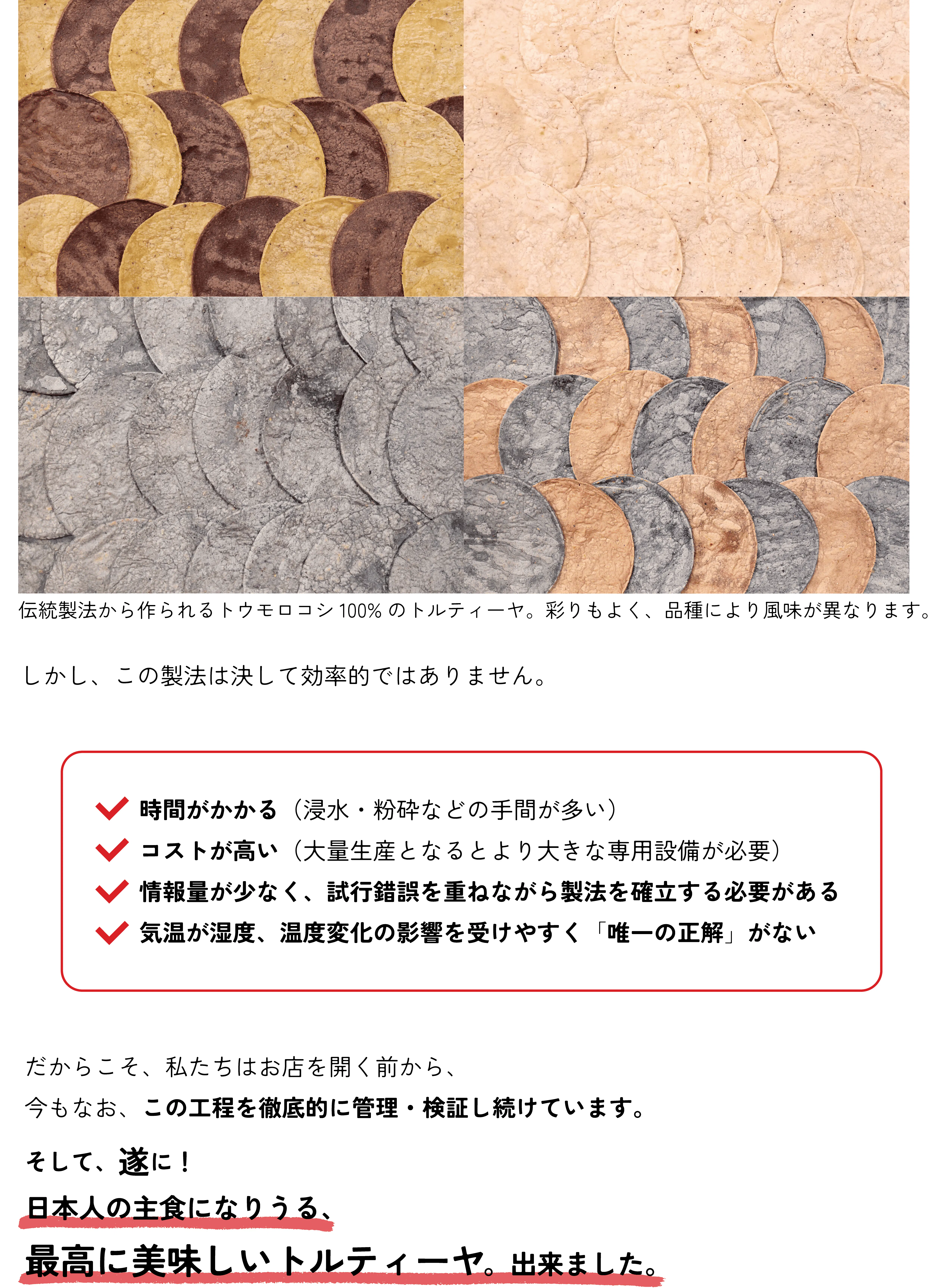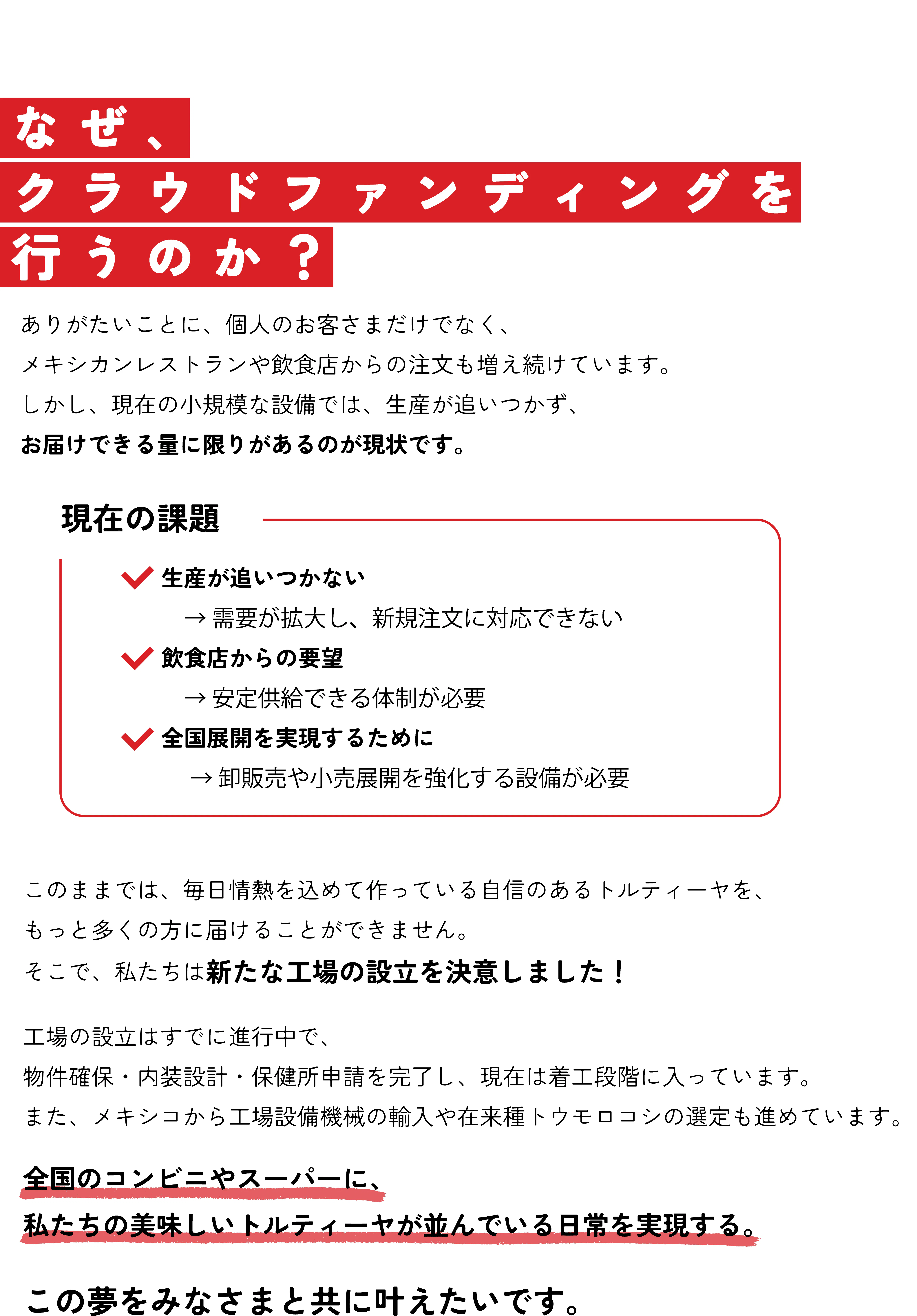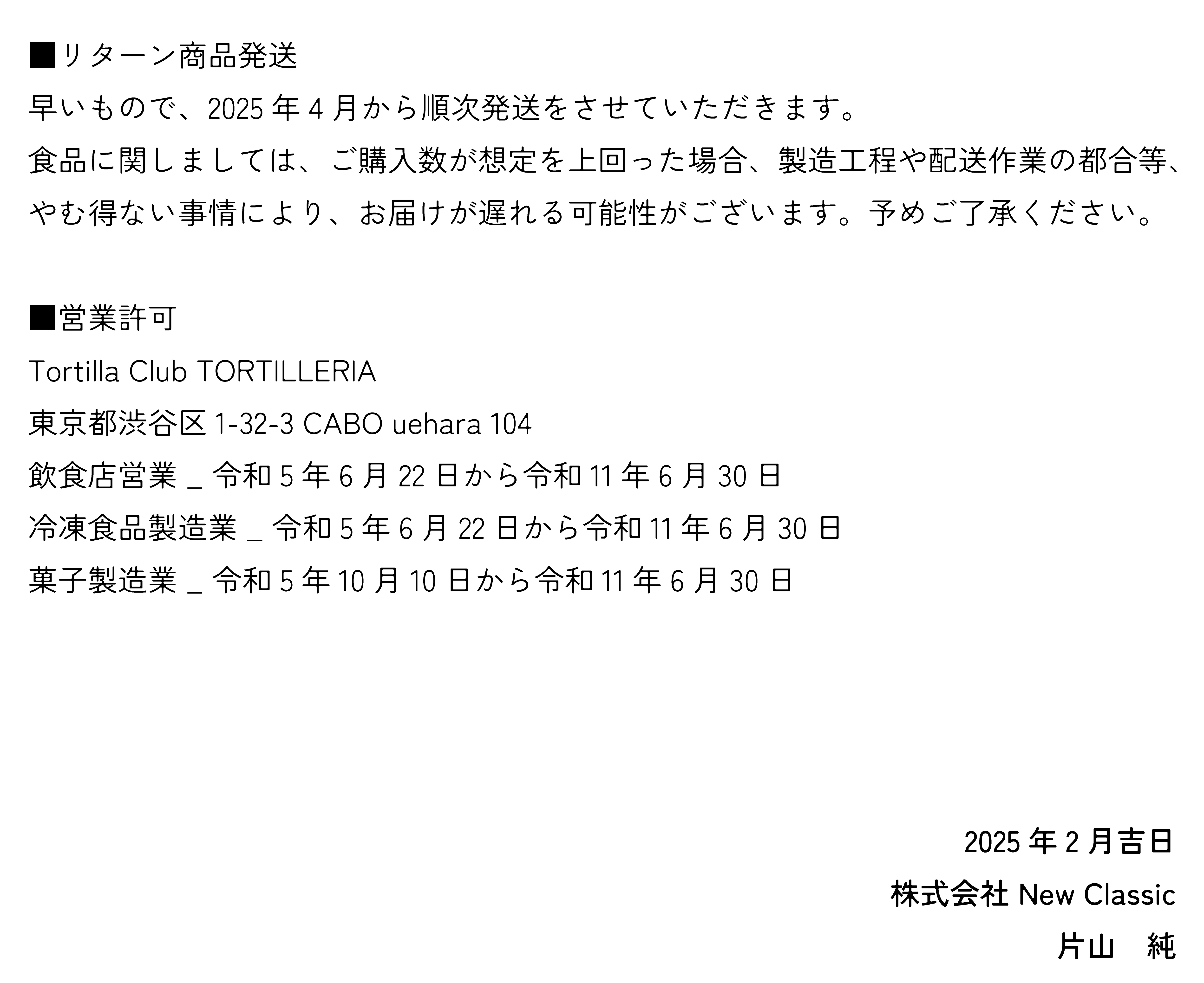 2025/06/12 15:16みなさま、こんにちは!トルティーヤクラブです。本日はリターン品の発送予定日につきまして、目処が立ちましたのでご案内をさせていただきます。(サルサセット/トルティーヤプレスセットのぞく)---------↓↓【発送予定日のご案内】↓↓----------------【 通常便 】●発送予定日①6/16(月)●該当リターン・トルティーヤチップスセット・デラックスボックスBOX(Tシャツ/トルティーヤチップス)●お届け予定日翌日〜翌々日※遠方、離島などの一部地域、また配送状況により遅延が生じる可能性がございますこと、あらかじめご了承くださいますようお願い申し上げます。●配送会社佐川急便●追跡番号の有無あり。番号確定次第、順次メッセージ機能にてお送りいたします。●ご注意宅配便でのお届けとなります。ご不在の場合は不在票が投函されますので、再配達のご依頼またはお受け取り場所の変更等、お客様の方で手配くださいませ。※ご不在時の保管限度日数は初回配達時を含む8日間と規定されています。 日程の調整やお受け取り場所変更等のお問い合わせは、お住まい地域の佐川急便営業所へ直接お電話いただくようお願い申し上げます。-----------------------------------------------------------------【 クール便 】●発送予定日②6/17(火)●該当リターン・トルティーヤ3種食べ比べセット・トルティーヤ5種食べ比べセット・ノパルセット・タコススターターBOX・スペシャルBOX・デラックスボックスBOX(食品)●お届け予定日翌日〜翌々日※遠方、離島などの一部地域、また配送状況により遅延が生じる可能性がございますこと、あらかじめご了承くださいますようお願い申し上げます。●配送会社佐川急便●追跡番号の有無あり。番号確定次第、順次メッセージ機能にてお送りいたします。●ご注意飛脚クール便でのお届けとなります。ご不在の場合は不在票が投函されます。再配達のご依頼またはお受け取り場所の変更等、お客様の方で手配くださいませ。※ご不在時の保管限度日数は初回配達時を含む4日間と規定されています。 日程の調整やお受け取り場所変更等のお問い合わせは、お住まい地域の佐川急便営業所へ直接お電話いただくようお願い申し上げます。●タコススターター/スペシャル/デラックス のお客様へのお願いこちらはセット内容のサルサが同梱されております。サルサは冷蔵品のため、到着後は冷蔵庫へ保管くださいますようお願い申し上げます。 -----------------------------------------------------------------●お客様へのお願い・冷凍リターンは特に保管期間が短いため、できる限り早めのお受け取りをお願いいたします。・ご不在票が投函された後、保管限度日数までに再配達依頼をしなかった場合、当社へと返送されてしまいます。ご注意くださいませ。・万が一以下のようなことがございましたら、メッセージ機能より氏名記載の上、お問い合わせくださいますようお願い申し上げます。ー『お荷物が届かない(不在票すら入っていない)』ー『追跡番号が届いていない』ー『リターン品内容の不備』●コーントルティーヤについてコーントルティーヤの表面に白っぽさや粒状の斑点が見られる場合がありますが、これは在来種とうもろこしの特性や製造過程によるものであり、品質には問題ございません。安心してお召し上がりくださいませ。●同じ商品を複数後購入/まとめてご支援いただいた皆さまへお届け先がそれぞれ異なる場合は、それぞれのセットに通常通りの内容を同梱しております。一方で、お届け先が同一の場合は、お礼のお手紙・商品説明は1通分のみとし、ステッカーはご購入枚数分をお入れしております。ご理解いただけますと幸いです。内容にご不明な点がございましたら、お気軽にお問い合わせくださいませ。 もっと見る