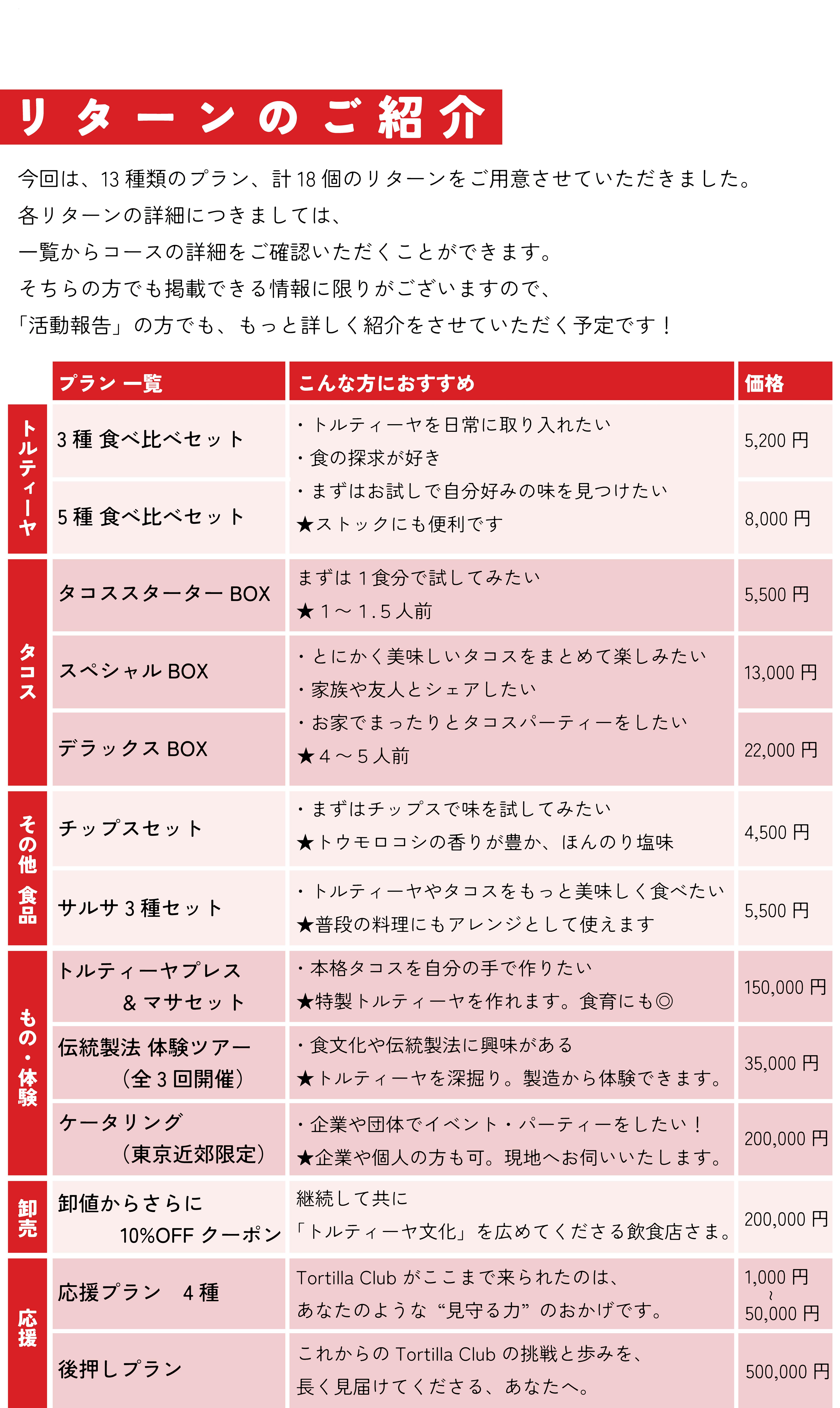 2025/06/17 13:32みなさん、こんにちは!トルティーヤクラブです。大変お待たせいたしました。以下のリターン品につきまして、すべての発送が完了いたしました!-----------------------------------------------------------------●発送完了リターン一覧・『3種のトルティーヤ食べ比べ』(冷凍)・『5種のトルティーヤ食べ比べ』(冷凍)・『タコススターターBOX』(冷凍)・『スペシャルBOX』(冷凍)・『デラックスBOX』(冷凍/通常)・『ノパルセット』(冷凍)・『トルティーヤチップスセット』(通常)-----------------------------------------------------------------●配送に関するご案内すでに個別にご案内しておりますが、佐川急便公式LINE 使っていただくと、初回配達時からの再配達依頼や日時変更が簡単に行えます。ご不在時の保管限度日数は以下の通りです:・冷凍便:初回配達時より【 4日間 】・通常便:初回配達時より【 8日間 】ぜひスムーズなお受け取りのためにも、ご活用くださいませ。※万が一お受け取りいただけなかった場合、商品は一旦弊社へ返送されます。食品の性質上、安全と品質保持の観点から、返送品は廃棄となり、あらためて準備を整えたうえで再発送いたします。そのため、できるだけ初回配達日を含め、お受け取り可能な状態でお待ちいただけますと幸いです。-----------------------------------------------------------------●万が一、内容物に不備や不測があった場合は...お手数をおかけしますが、「メッセージを送る」からご連絡くださいませ。すぐにご対応させていただきます!------------------------------------------------------------------------------●サルサ付きのセットをご支援くださった皆さまへ今回のリターンでは、通常は冷蔵商品であるサルサ類も冷凍便にて同梱しております。到着後は、冷蔵庫での保管をお願いいたします。------------------------------------------------------------------------------最後にもう一度、心からの感謝を込めて。たくさんのご支援をいただき、本当にありがとうございました!皆さんの食卓で、トルティーヤやタコスBOXが楽しい時間や会話のきっかけになりますように。引き続き、残るリターン品についても順次お届け&ご案内いたしますので、どうぞお楽しみに!¡Gracias! もっと見る〈6月お届け〉リターン品の発送予定につきまして