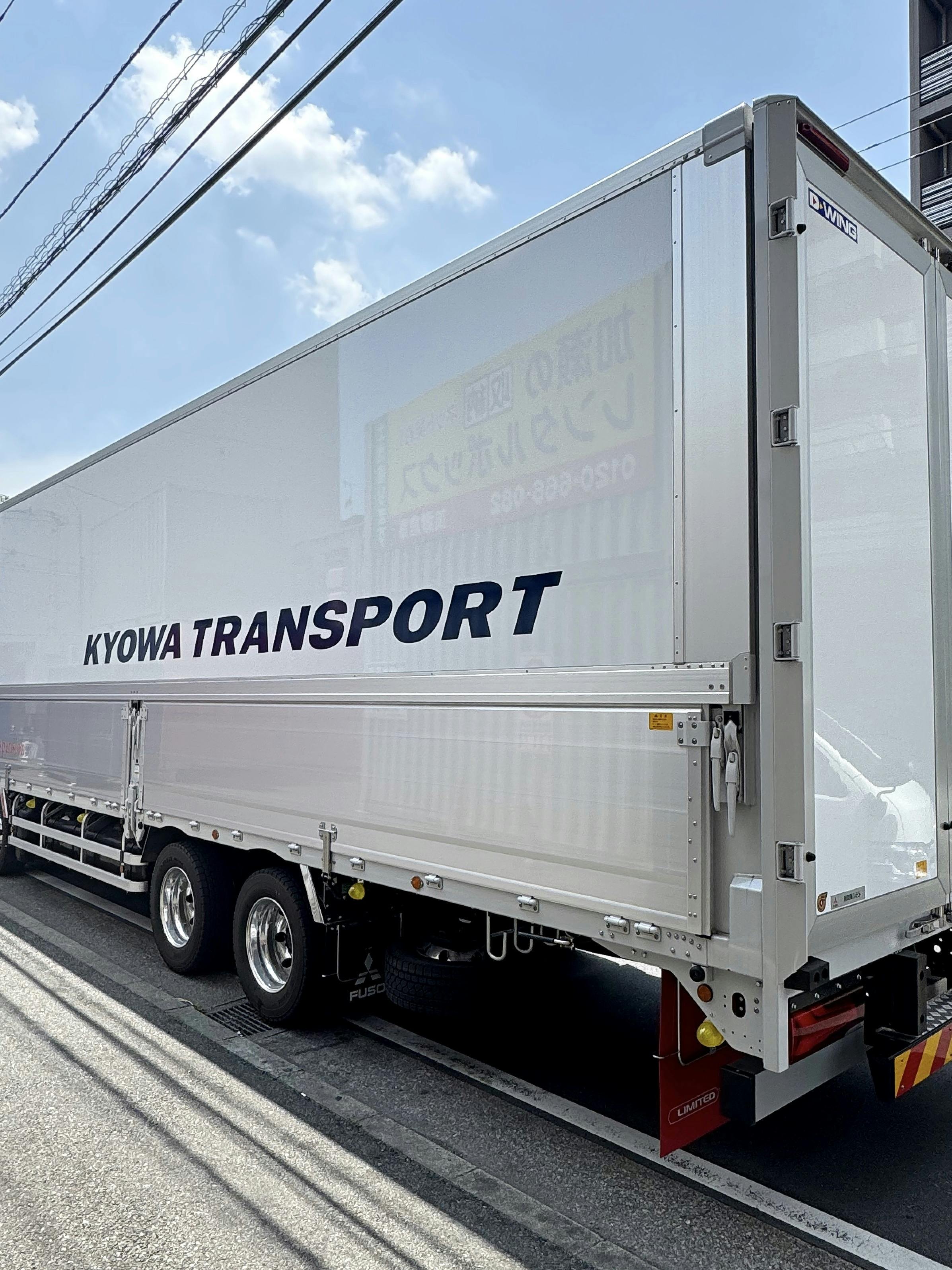トラック側面のパネルがウィーンと自動で開く、10tウィング車の到着です。