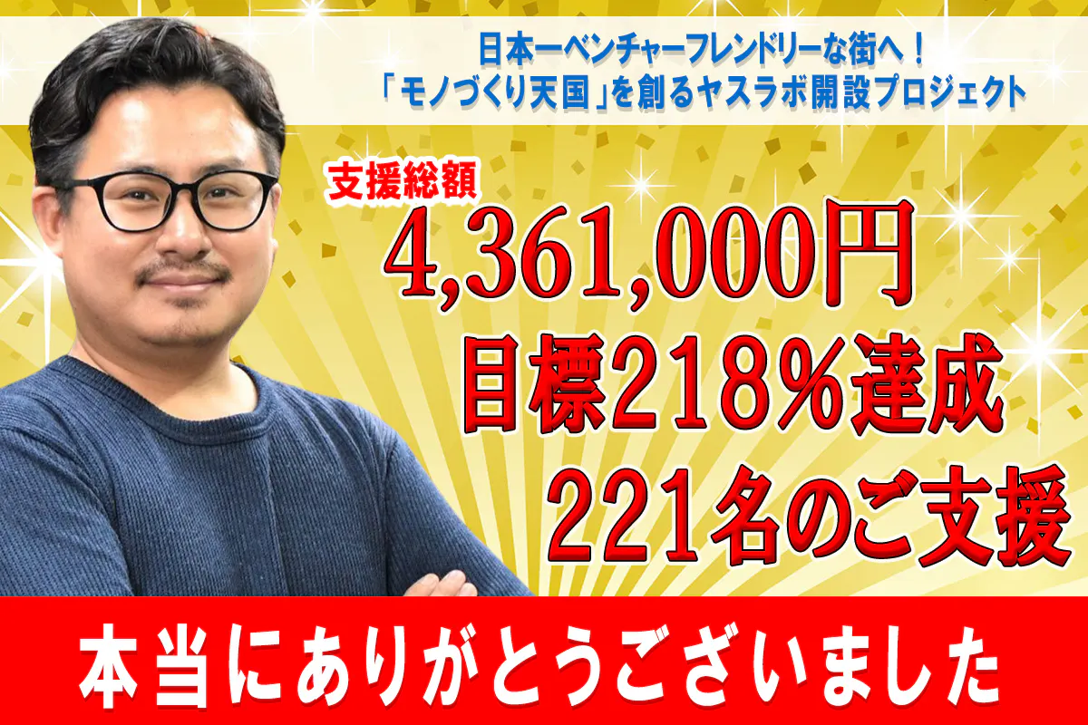 2025/06/16 21:50ご報告が遅くなってしまいましたが、先月末に、ヤスラボのクラウドファンディングがおかげさまで、無事に終了しました。その結果――支援総額:4,361,000円(目標達成率 218%)ご支援者数:221名と、予想を上回る結果となりました。本当に、本当にありがとうございました!!!みなさまの応援が、この大きな結果を作ってくださりました当初、目標として掲げた200万円。いざふたを開けてみれば、2nd GOAL 300万円、3rd GOAL 400万円も超え、私たちの想像をはるかに上回るご支援と応援が集まりました。リターンにご応募いただく度に、飛び上がるほどうれしく、また、勇気をいただき、背中を押していただけるような気持ちになりました!ヤスラボは、いよいよここから本格始動です。いただいたご支援は、世界最速級の3Dプリンター導入、プロトタイピング機材の拡充、そして挑戦する人たちが交わる“ものづくりの実験場”をさらに深めるための設備投資へと、大切に使わせていただきます。ここからが本当のスタートです今回のクラファンはこれで終わりましたが、ヤスラボはこれからが本番です。ものづくりをもっと身近に、自由に、そして面白く。この場所から生まれるプロジェクトや出会いが、少しずつでも世の中をワクワクさせるものであるように、これからも一歩ずつ、走っていきます。そして、ヤスラボはいつでも開かれた場所であり続けます。今回ご支援いただいた皆さまとは、これからも何らかの形でつながり、一緒にこの場所を育てていきます。リターンについてのご案内リターンにつきましては、ご支援いただいた皆さまに順次ご連絡を差し上げます。発送時期やご案内の詳細については、メッセージ機能および個別のメール等でご連絡させていただきますので、よろしくお願いいたします。あらためて、221人の皆さまに、心の底から、ありがとうございます!!!そしてこれからも、ヤスラボをどうぞよろしくお願いいたします。 もっと見る