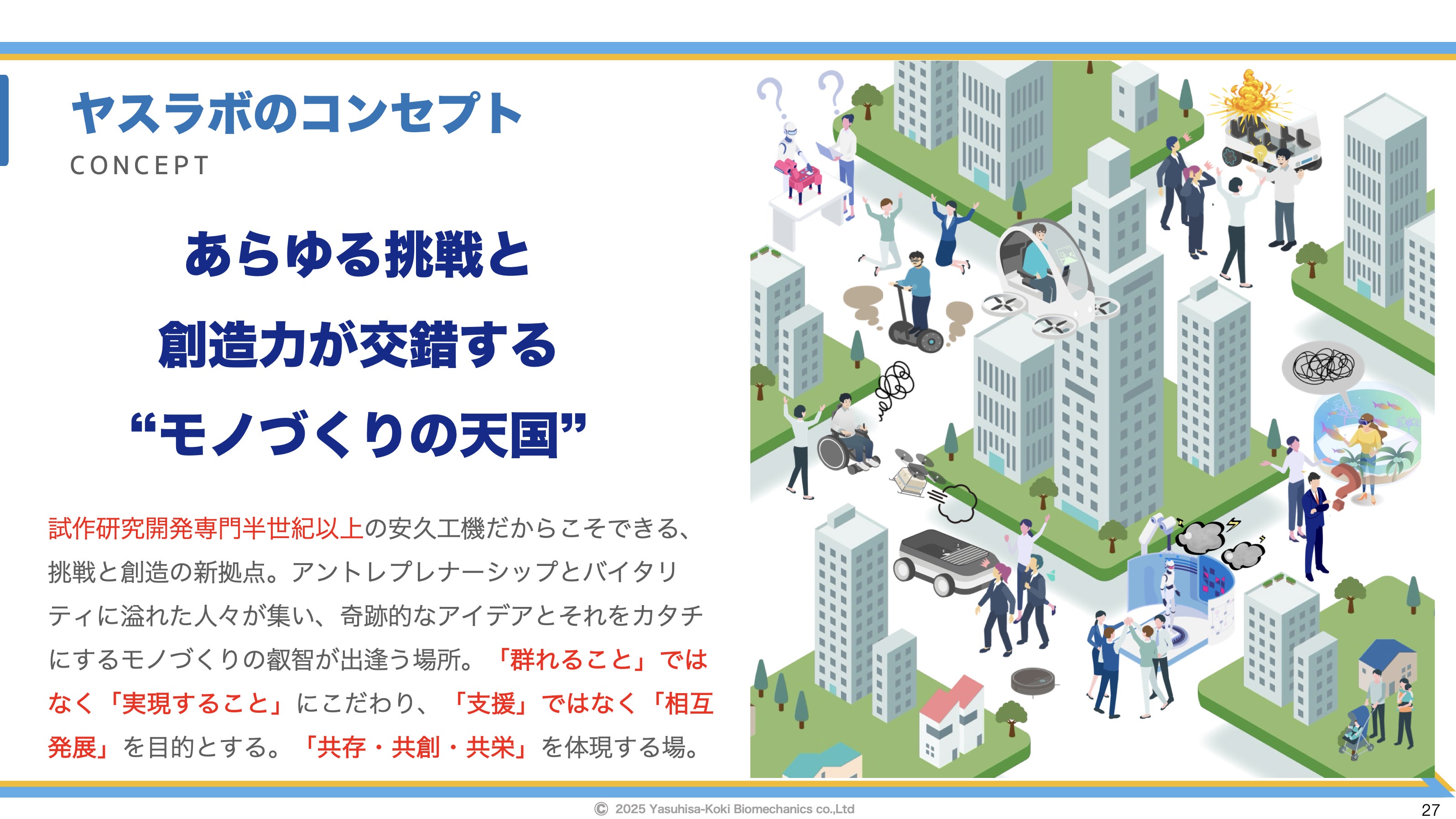 ヤスラボは、下丸子地域で初めての町工場が運営するインキュベーション&イノベーション創出拠点として、モノづくり天国のシンボル、イノベーターが集うランドマークとなるよう、地域内外の皆様の支援を受けプロジェクトを推進してまいります。