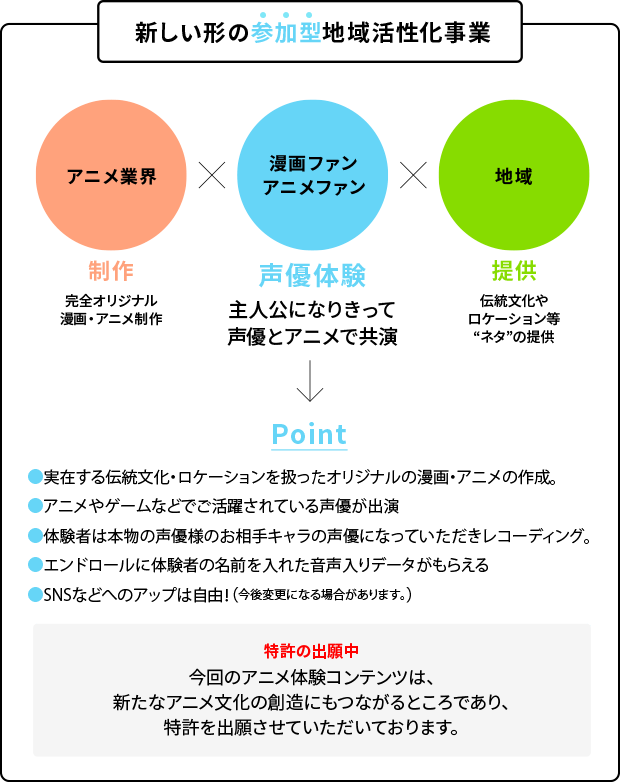 アニメへの声の出演、好きな声優との共演は、国内外問わずアニメ好きなら一度は憧れたは ず。 本事業の体験者には「アニメの主役になれた!」 「憧れの声優さんの作品に出演できた!」な ど最高の思い出を共有していただけます。 これまでなかった「声優体験」というアニメコンテンツができるということは、「新たなアニメ文 化の誕生」にもつながります