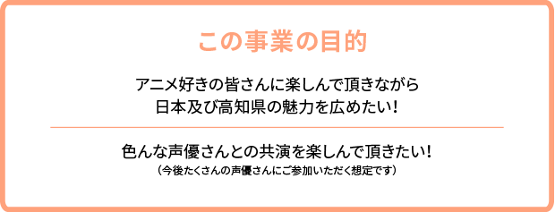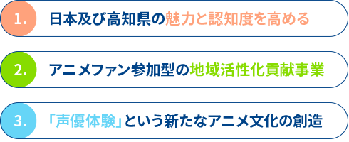 当プロジェクトは、アニメ出演体験という新コンテンツを生み出し、体験してもらうことで外国人及び日本人に対する高知県の認知度向上、高知県への旅行者の誘客など目指しつつ、世界に向けたジャパニメーションの普及、など日本の魅力や素晴らしさを広める要素も多分に含んだものとなっております。