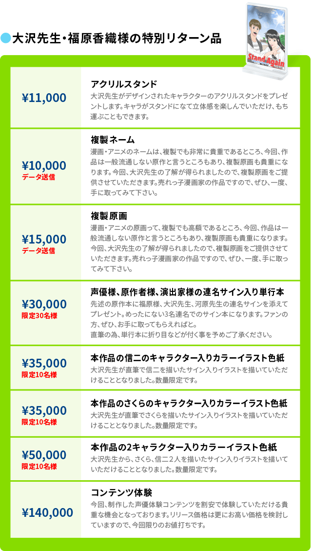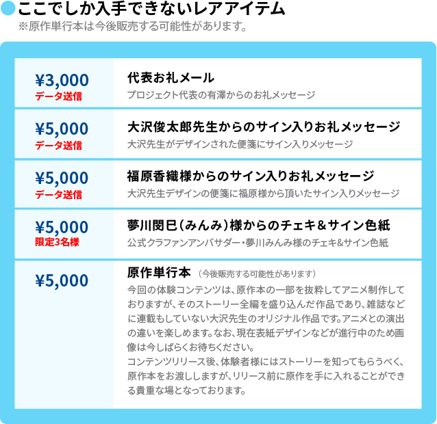 大沢先生・福原香織様の本プロジェクトにご用意された特別リターン品