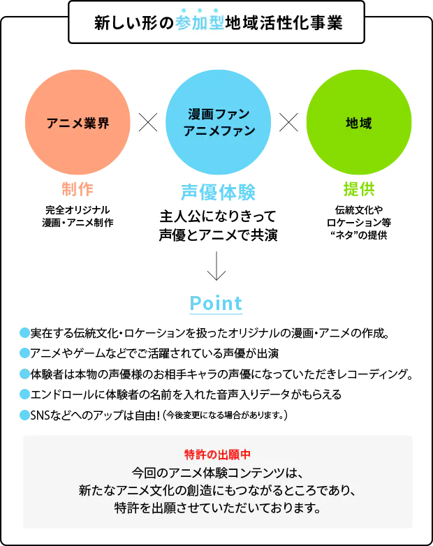 アニメへの声の出演、好きな声優との共演は、国内外問わずアニメ好きなら一度は憧れたは ず。 本事業の体験者には「アニメの主役になれた!」 「憧れの声優さんの作品に出演できた!」な ど最高の思い出を共有していただけます。 これまでなかった「声優体験」というアニメコンテンツができるということは、「新たなアニメ文 化の誕生」にもつながります