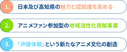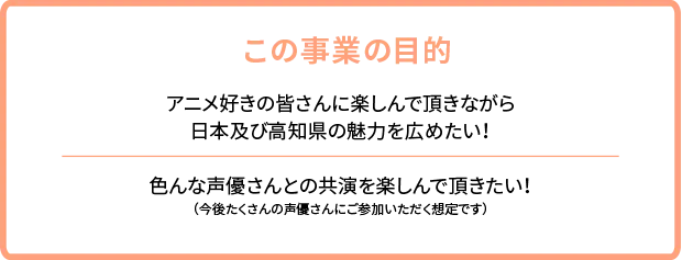 当プロジェクトは、アニメ出演体験という新コンテンツを生み出し、体験してもらうことで外国人及び日本人に対する高知県の認知度向上、高知県への旅行者の誘客など目指しつつ、世界に向けたジャパニメーションの普及、など日本の魅力や素晴らしさを広める要素も多分に含んだものとなっております。
